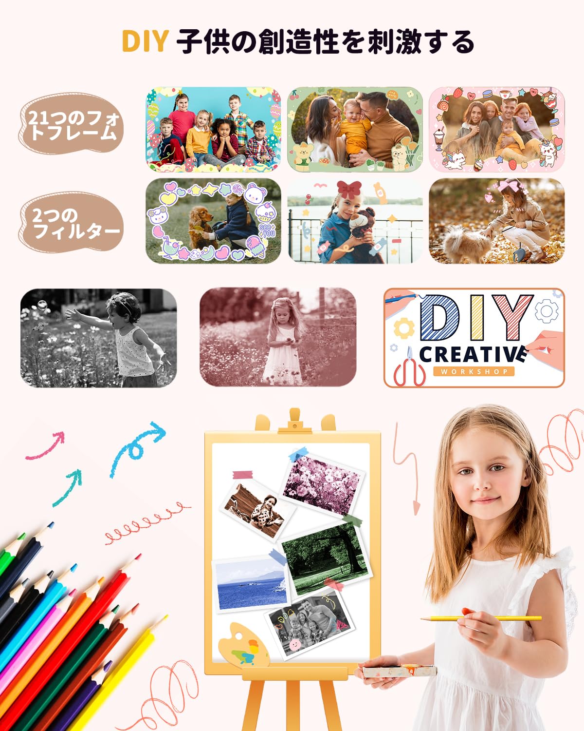 * 【2.0インチ大画面・日付機能付き】子供用プリントカメラは安全基準を備えた環境に優しい素材で、非毒性、耐衝撃性、耐久性のある素材。子供の目の健康に配慮された設計になっている、2インチカラーIPSスクリーンを採用されます。撮影を重ねることで、子供自身の撮影テクニックも向上していくでしょう。●日付機能付き、撮影時のタイムスタンプとしても重要、保護者が子供の活動を把握するのにも利用できます。