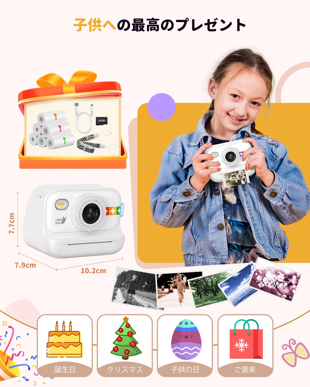 プリントカメラ 子供 インスタントカメラ 4色印刷: 2025年新登場 4800万画素 1080P動画 2.0インチIPS画面 キッズカメラ 感熱紙 32GBメモリーカード ストラップ付き USB充電 トイカメラ 印刷機能付き 3-12歳 女の子 男の子 子供の日 誕生日 クリスマス 新年のプレゼント 日本語取扱説明書 (カラー 感熱紙, ホワイト)
