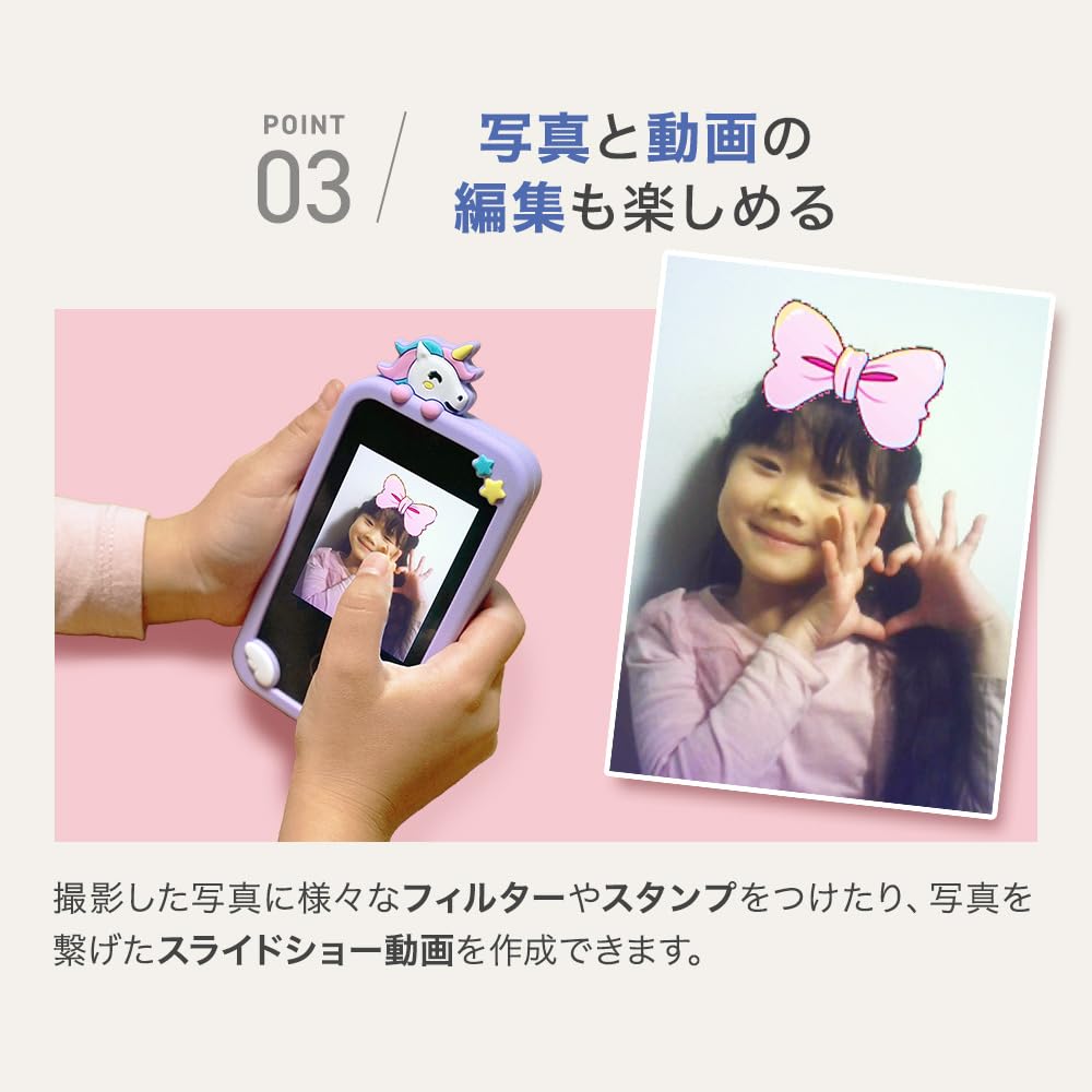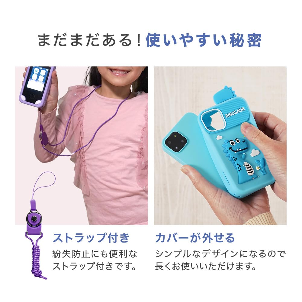 キッズスマホ スマホ型 キッズカメラ 子供用 知育玩具 知育ゲーム 自撮り 録音 ユニコーン 恐竜 女の子 男の子 メモリーカード シリコンカバー ストラップ付 (パープル)