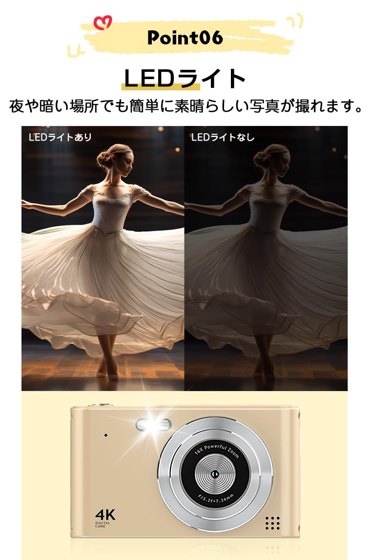 * 【コンパクトなデジカメ】 子供、学生、高齢者、女性にも使いやすいコンパクトなデジタルカメラはわずか120gの重量でポケットに入れやすく、日常の使用はもちろん、旅行時にも持ち運びに便利です。初心者でも満足された機能が搭載されてあり、いつでもどこでも幸せな瞬間を捉えることができます。ストラップが付属されて紛失の心配もありません。