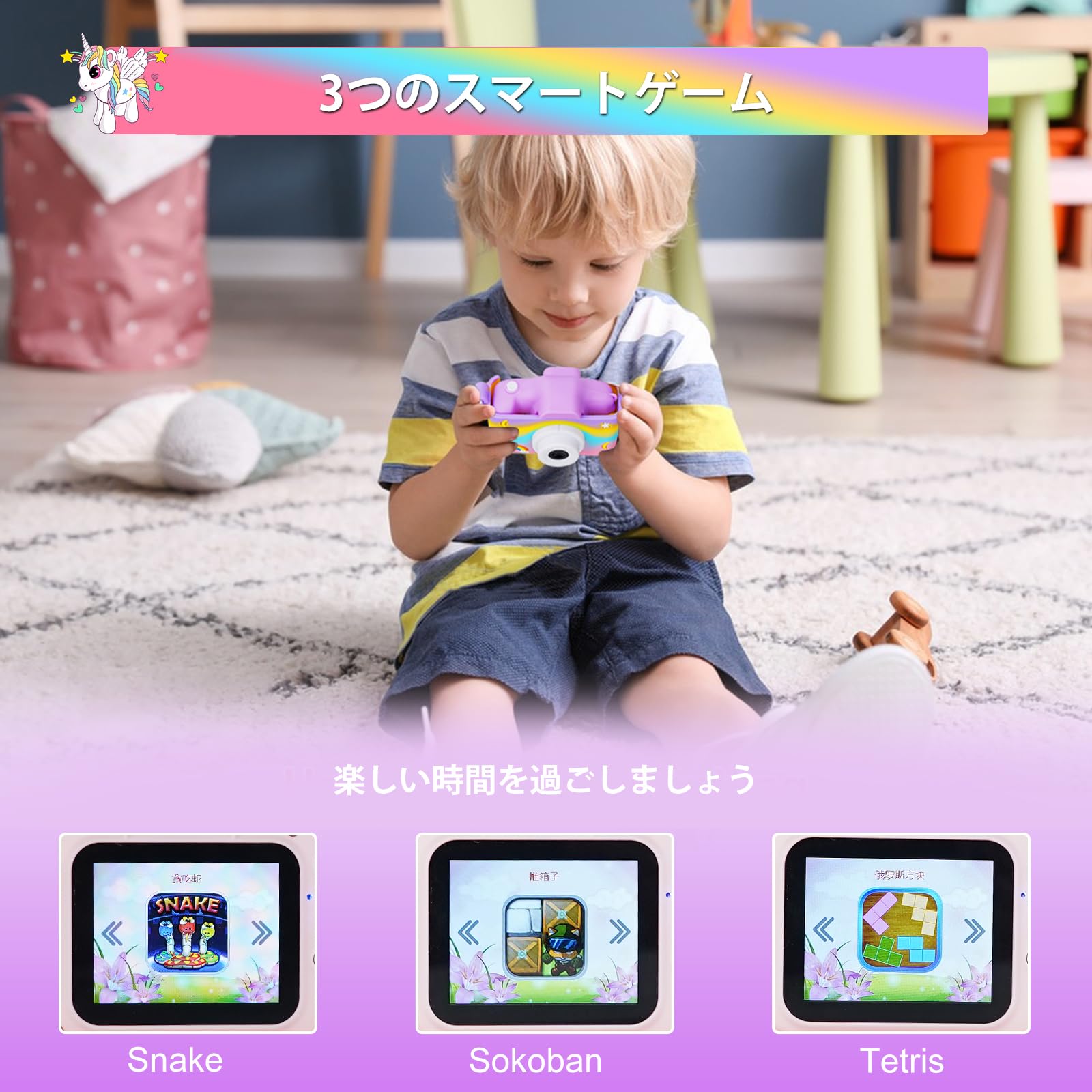 * 多機能子供用カメラ:写真を撮るだけでなく、様々なな機能も付けており、タイミング写真、再生、ゲーム、フォトステッカー、音楽再生、連続撮影、セルフィー、ビデオなどの機能があります。 操作画面は日本語対応、6種類写真フィルターと5種類面白い分割画面、28種類のフレームもある、綺麗な写真を撮ることができます。子供たちにデジカメの魅カを感じさせ、幸せな時間を作られしましょう!