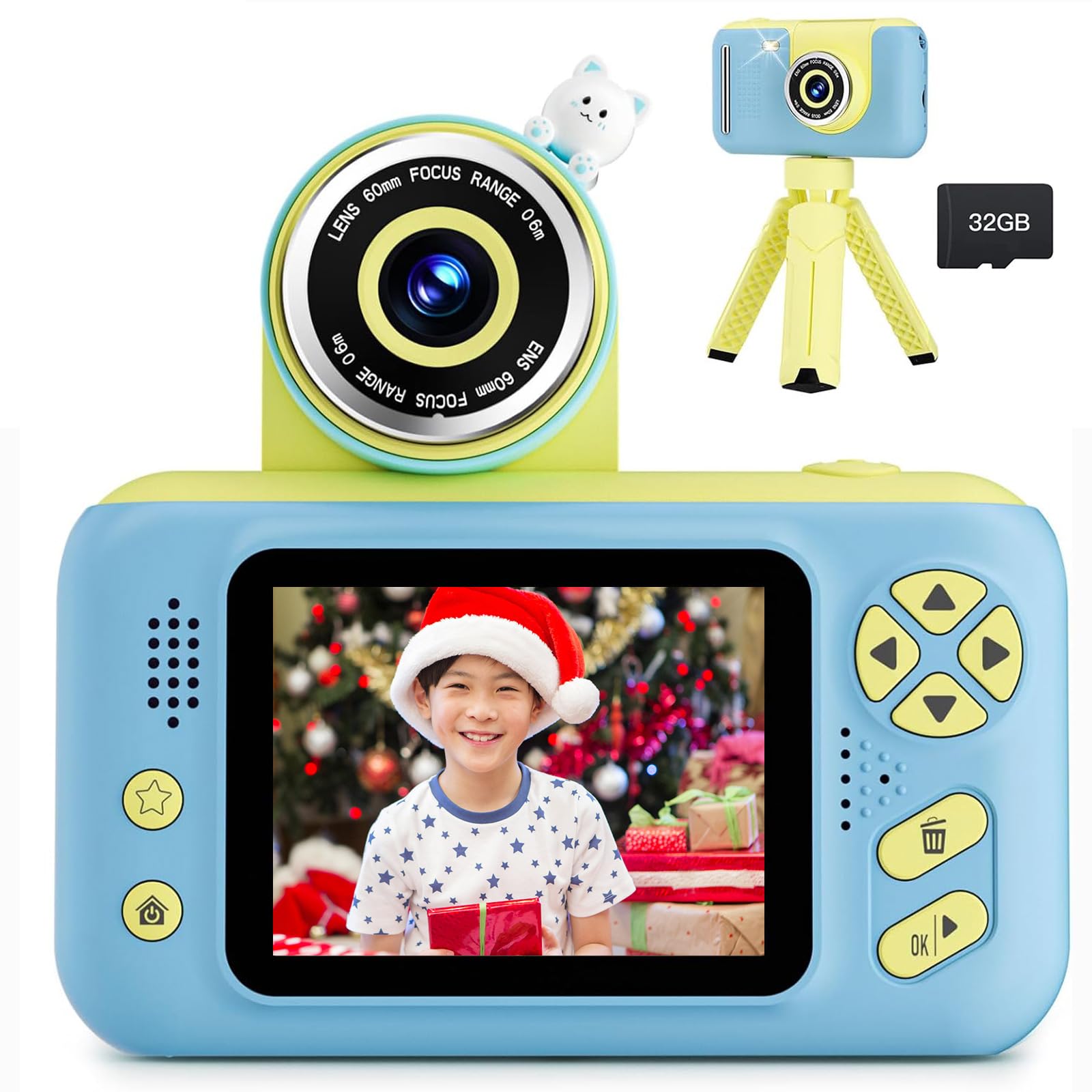 キッズカメラ三脚付き子供用カメラ ビデオカメラおもちゃ 180°回転レンズ付き 小学生用 2.4 インチ ディスプレイ デジタルカメラ 初心者 コンパクトカメラおもちゃ お子様へのプレゼント 3-10歳 女の子 男の子 誕生日プレゼント 子供の日のプレゼント32GB SDカード付き 子供 カメラ(ライトブルー)