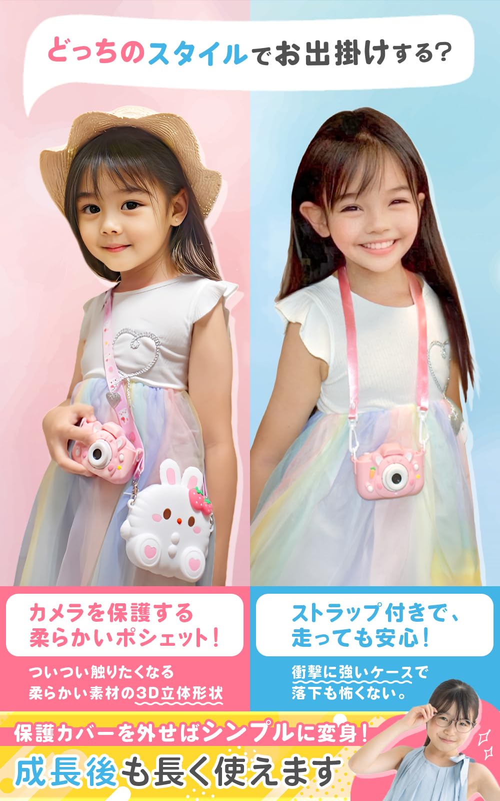 * 【popomaキッズカメラのおすすめポイント】キッズカメラには、かわいいウサギのポーチがセットになっています。柔らかい素材で触り心地が良く、キッズカメラを持ち運ぶのにもぴったりです。子供用・大人用の2種類の説明書があり、子供でも使い方がすぐに理解できる工夫がされています。