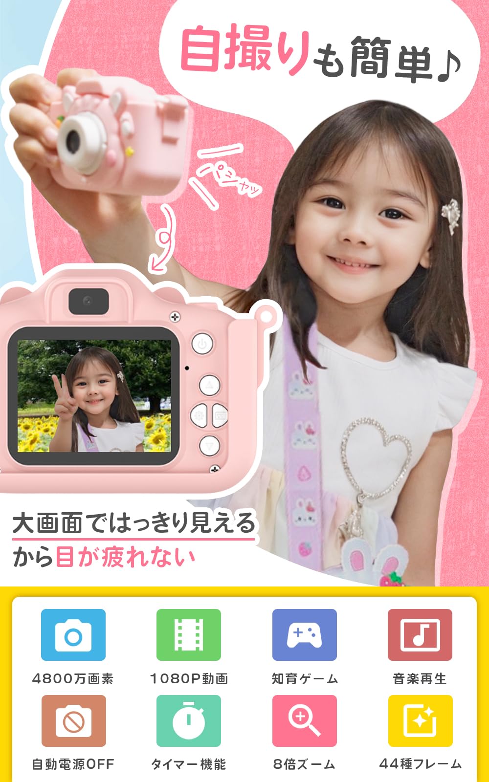 【64GB付 ポシェットセット】ウサギ キッズカメラ トイ 子供用 国内サポート 4800万画素 1080P HD 日本語説明書 ゲーム機能 クリスマス プレゼント 女の子 ピンク popoma