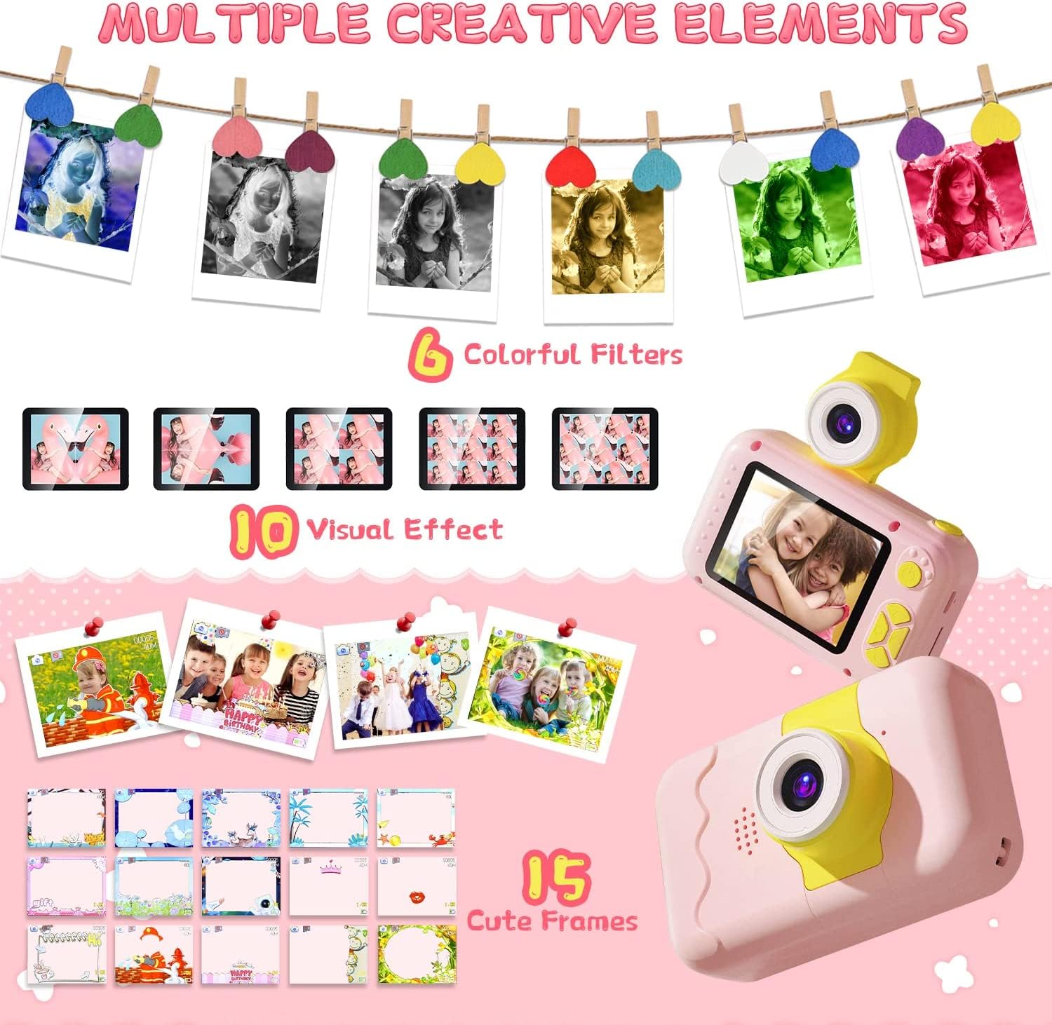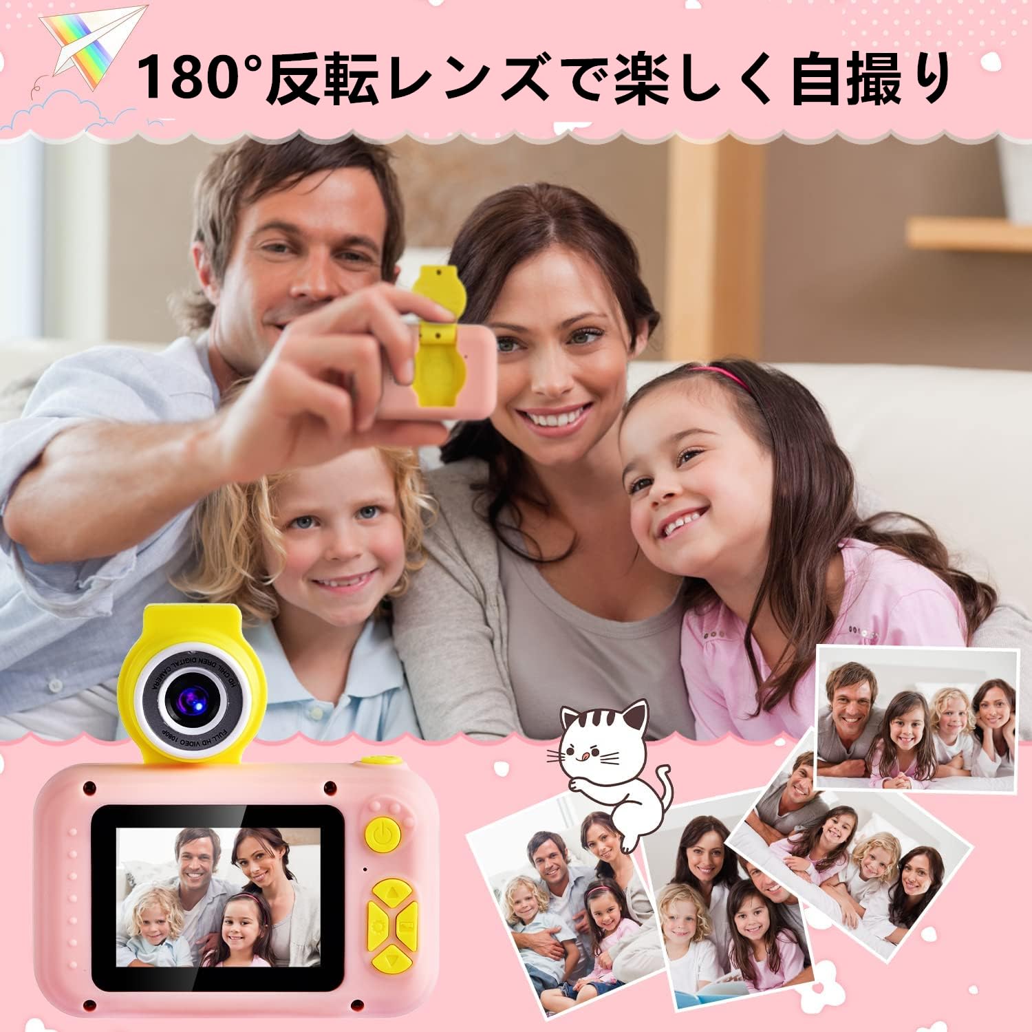 * 【レンズ180°反転可能&素晴らしいキッズカメラ】 写真や録画のほか、レンズを180°反転するだけで自撮りを実現することができます。子供用カメラ にはタイマー撮影、32種類の写真フレーム、MP3音楽、5種類のゲーム、遅延録画、スローモーション録画、4倍ズームなど多彩な機能が含まれており、子供の好奇心を広げ、成長をサポートします。日付ラベルの追加もでき、大事な日を忘れずに記録しておきましょう。