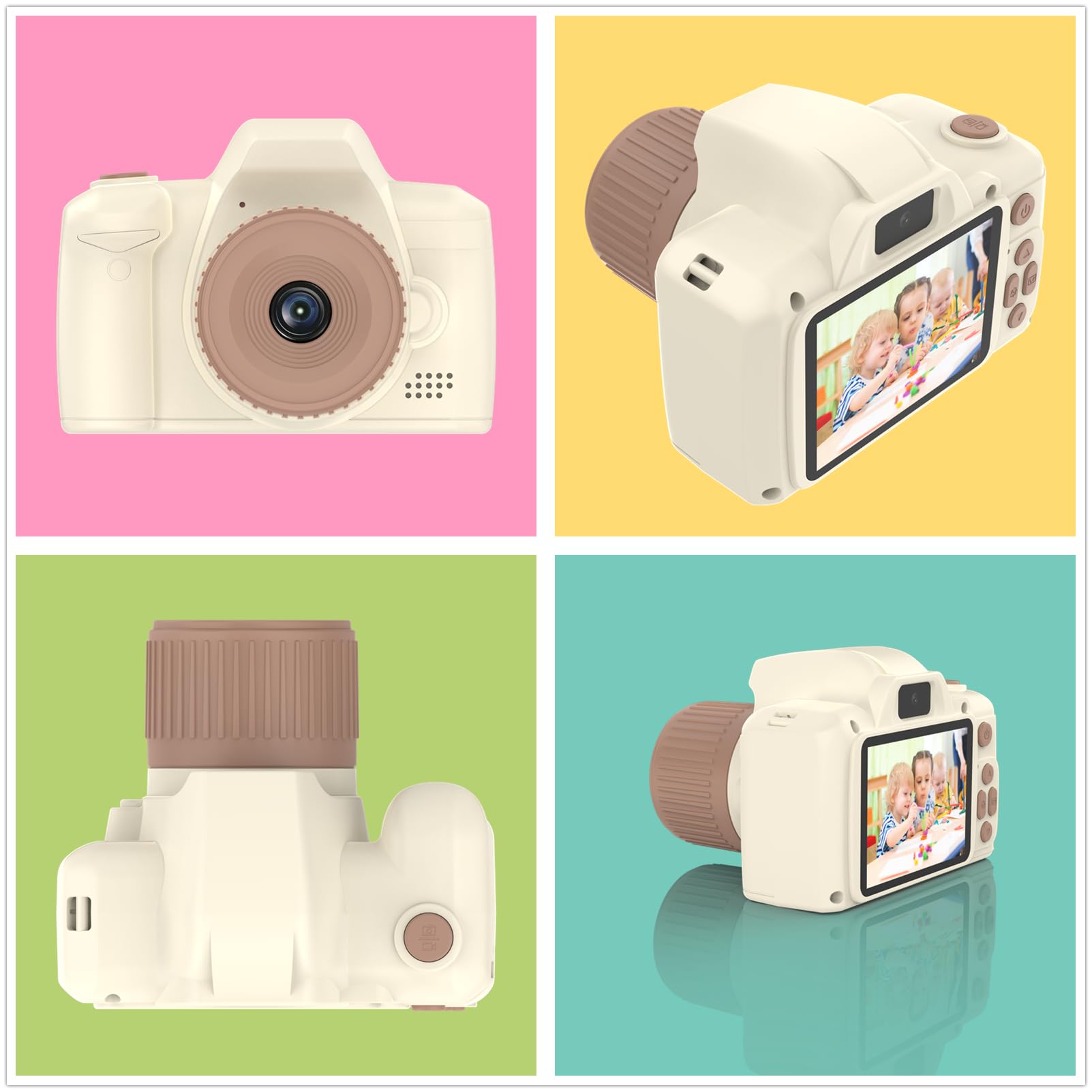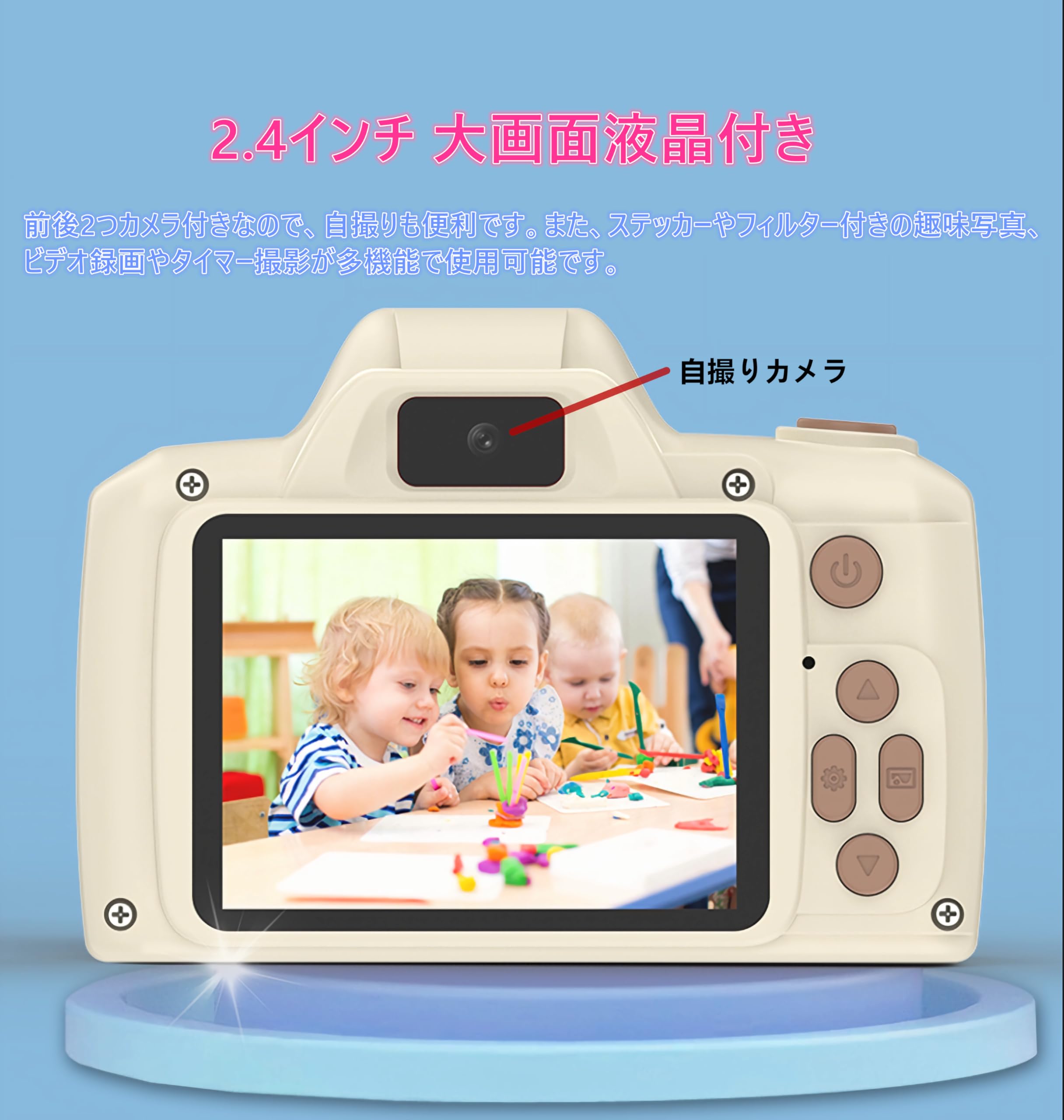 * 【一眼レフ デザイン】 一眼レフ カメラの斬新なデザインにより、お子様は小さな写真家のようになります。 オートフォーカス機能により、元気なお子様も素敵な瞬間を簡単に撮影できます。使い方はシンプルですので撮影に興味を持ち始めたお子様にピッタリ! すぐうまく利用出来ますので、写真を撮る楽しみを増やします。 お子様の想像力を高めるきっかけに!ボタンを押すだけで、最高の思い出の写真が簡単に撮れます。 楽しい時間、感動な瞬間などをカメラで留められます!