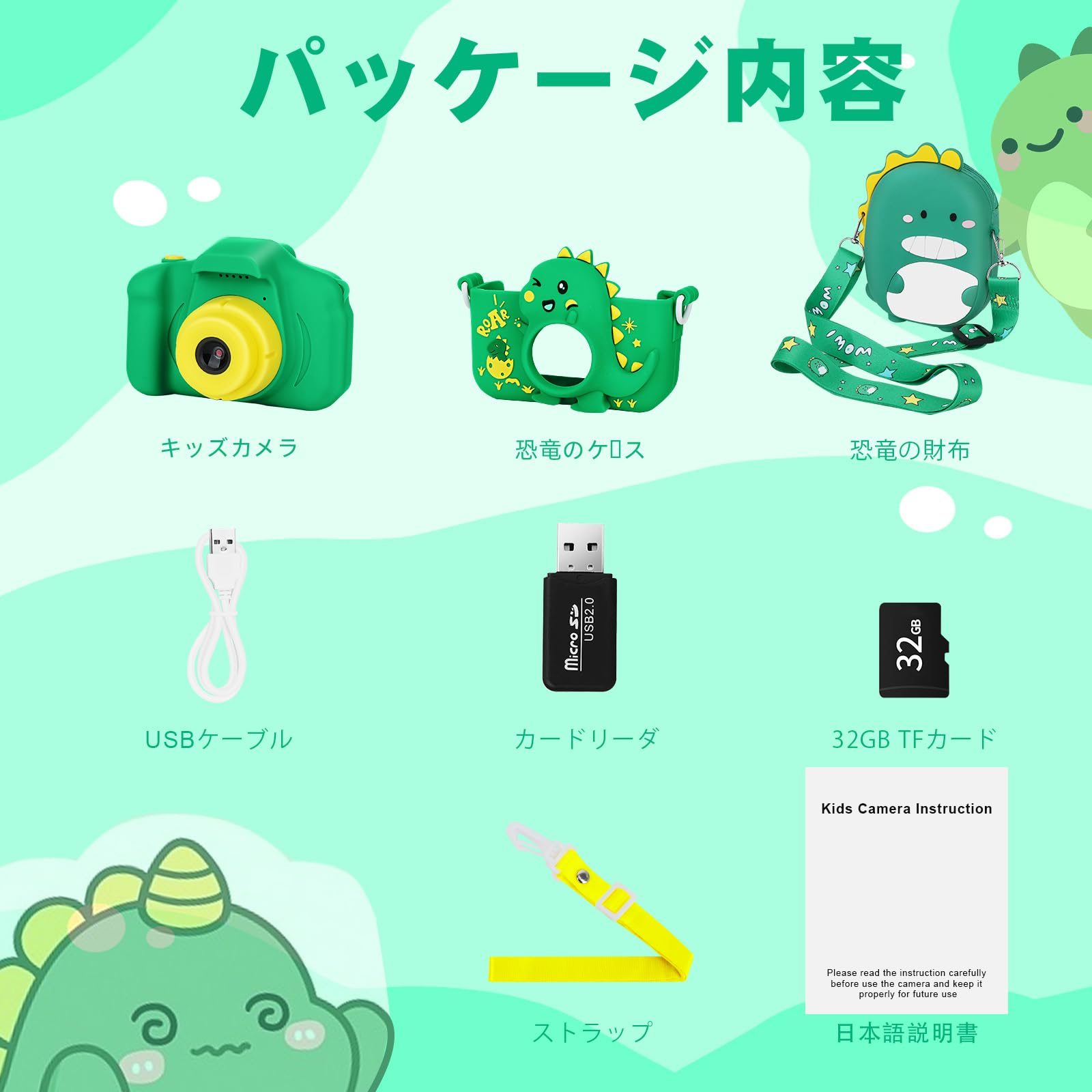 * 【可愛い恐竜保護ケース&便利な恐竜バーグ】弊社のトイカメラにはかわいい恐竜のシリコーンケースが付属しており、このようなカメラは衝撃を吸収し、倒れた場合でも、カメラを保護することができます。子供たちに安心に使用するように、カメラ本体と同じ色で長さ調節可能なストラップと恐竜バーグも付属されております。子供たちはカメラを首にかけることができ、使いたくなければ恐竜バッグに入れることもでき、6-12歳の男の子と女の子のアウトドアで使いやすいおもちゃになっています。