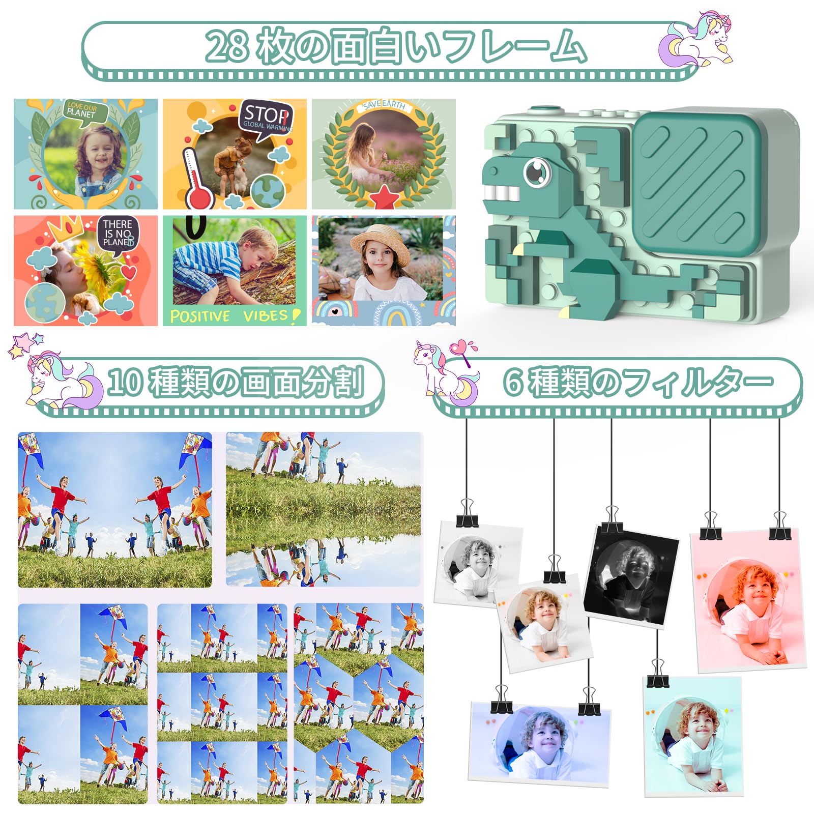 * 【多機能な子供用カメラ】この子供 デジカメはいるいるな機能も付けており、写真撮影、ビデオ録画、音楽再生、ゲーム、タイムラプス撮影などの機能があります。それに、6種類写真フィルターと5種類面白い分割画面のほかに、28種類のフレーム機能がある綺麗な写真を撮ることができます。子供たちにカメラの魅カを感じさせ、写真を通じて人生の美しい瞬間を記録しましょいう。