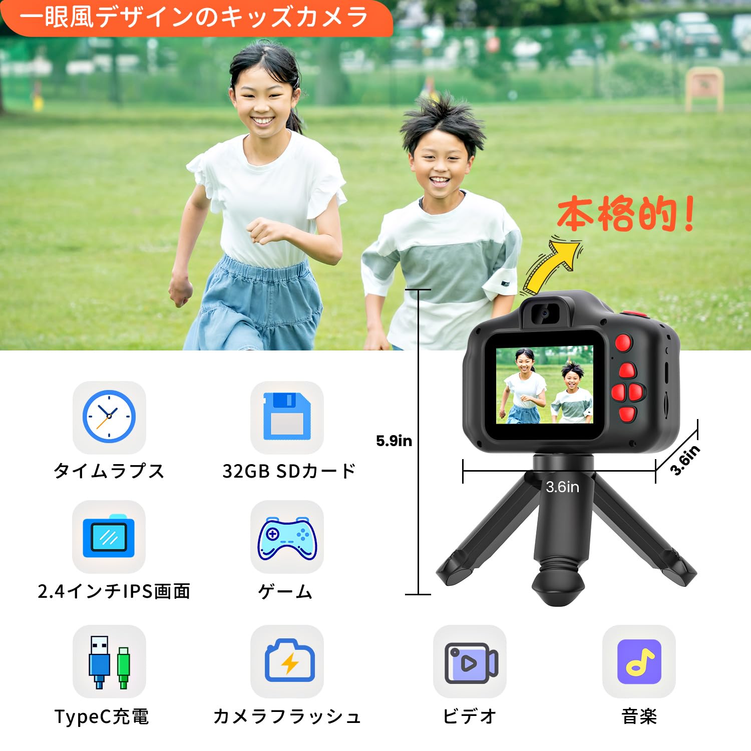 * 【本格的な子どもの初めてデジタルカメラ!】 4000万画素&1080P動画という本格的な性能に、お子様が楽しめる機能を融合。単なるおもちゃではなく、小学生向けにも満足できる高画質撮影と、創造性を刺激する内蔵コンテンツで、お子様の「撮りたい!」を全力サポートします。SDカードもついてますので、パッケージを開けたその時から遊べます。