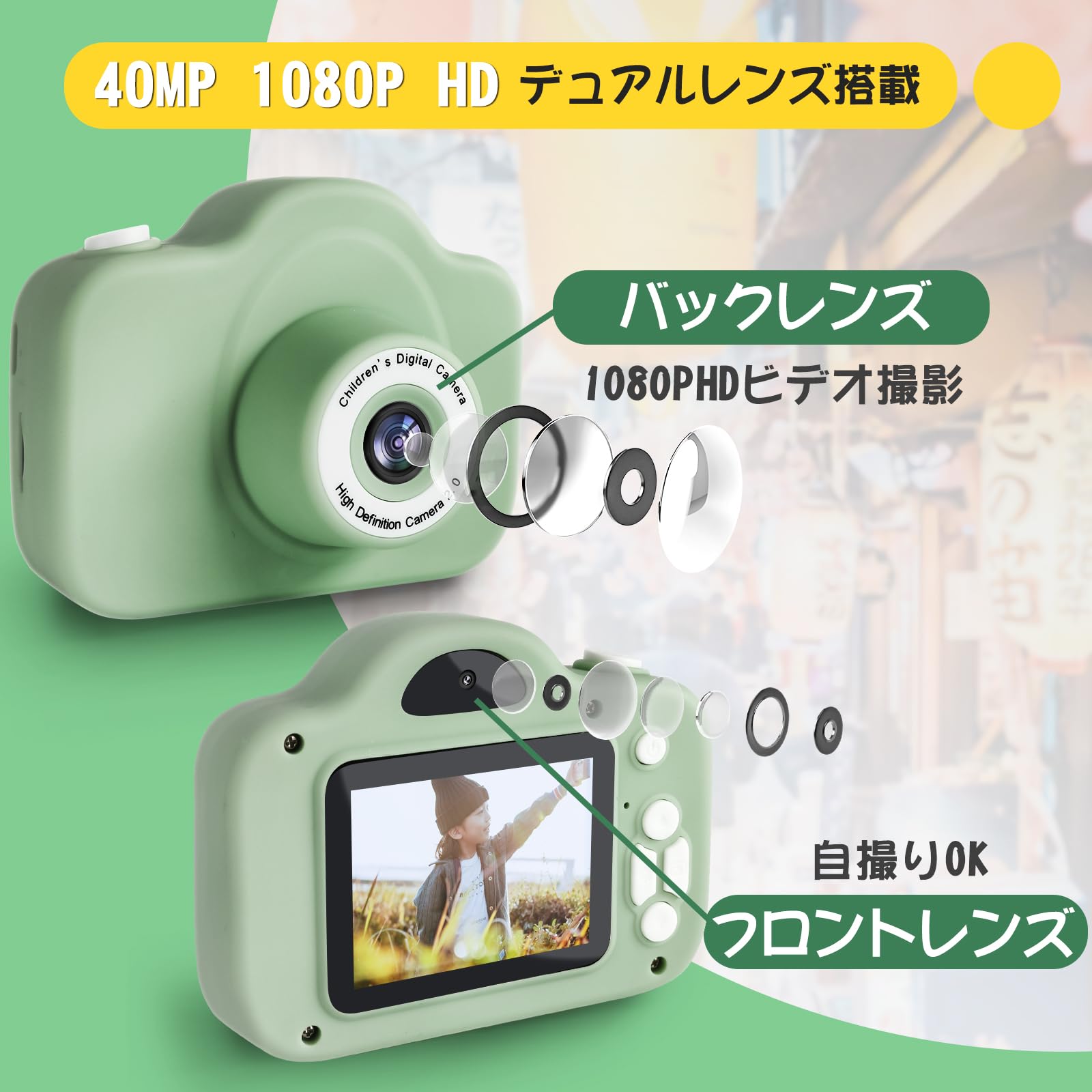 Yireal キッズカメラ 子供用 トイカメラ 子供用デジカメ ひらがな操作パネル 目に優しい設計 自撮りカメラ キッズデジカメ子供の日プレゼント 2000万画素 1080P HD 動画カメラ 2インチ 画面 USB充電式 男の子 女の子 おもちゃカメ 32GB SDカード付き 人気 ギフト 誕生日 プレゼントギフト 贈り物 日本語取扱説明書付き