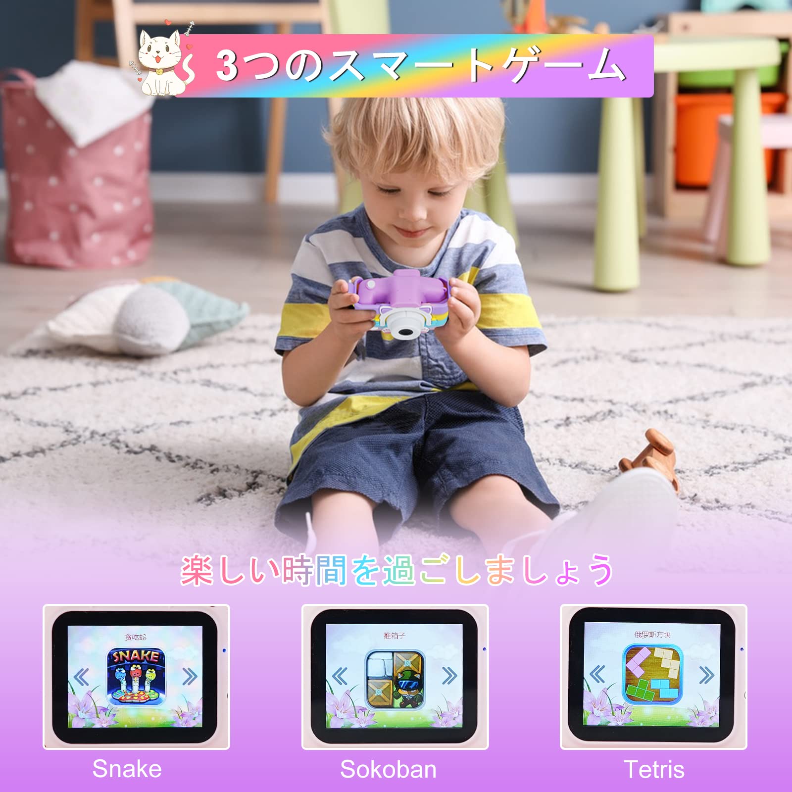 * 【多機能なキッズカメラ】写真を撮るだけでなく、いるいるな機能も付けでおり、タイミング写真、再生、ゲーム、フォトステッカー、音楽再生、連続撮影、セルフィー、ビデオなどがあります。 操作画面は日本語対応し、それに、6種類写真フィルターと5種類面白い分割画面のほかに、28種類のフレーム機能がある綺麗な写真を撮ることができます。子供たちにカメラの魅カを感じさせ、幸せな時間を作られましょいう。