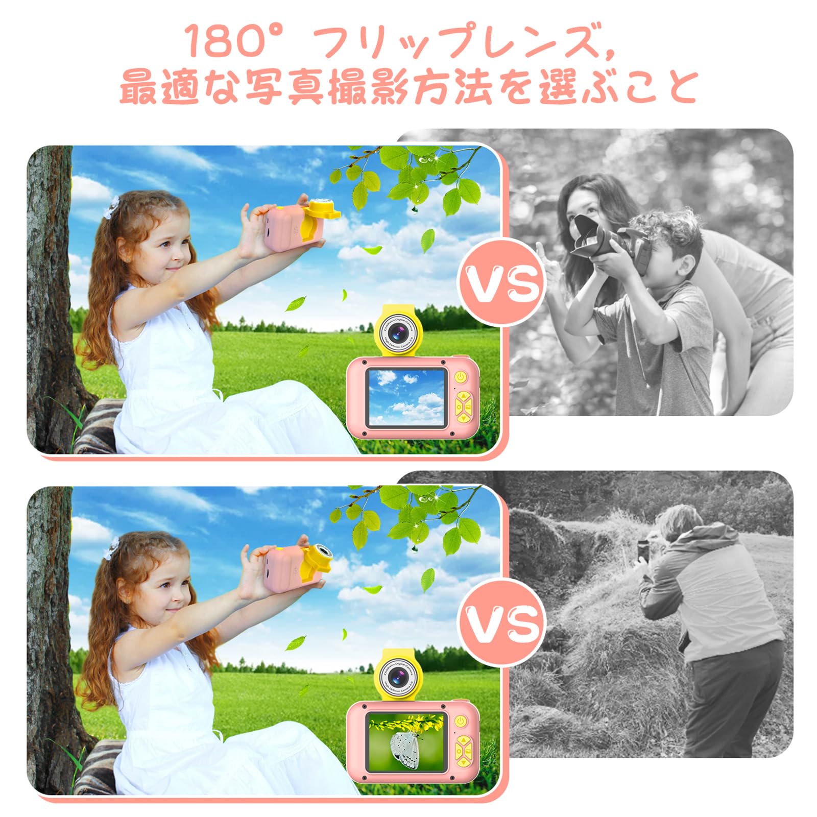 * 【180°フリップレンズ&もっと面白く】180°フリップレンズは、より柔軟で面白く、より多くのアングルでの撮影を可能にします。レンズを回すだけで、お子様でも簡単に自撮りモードが使えます。