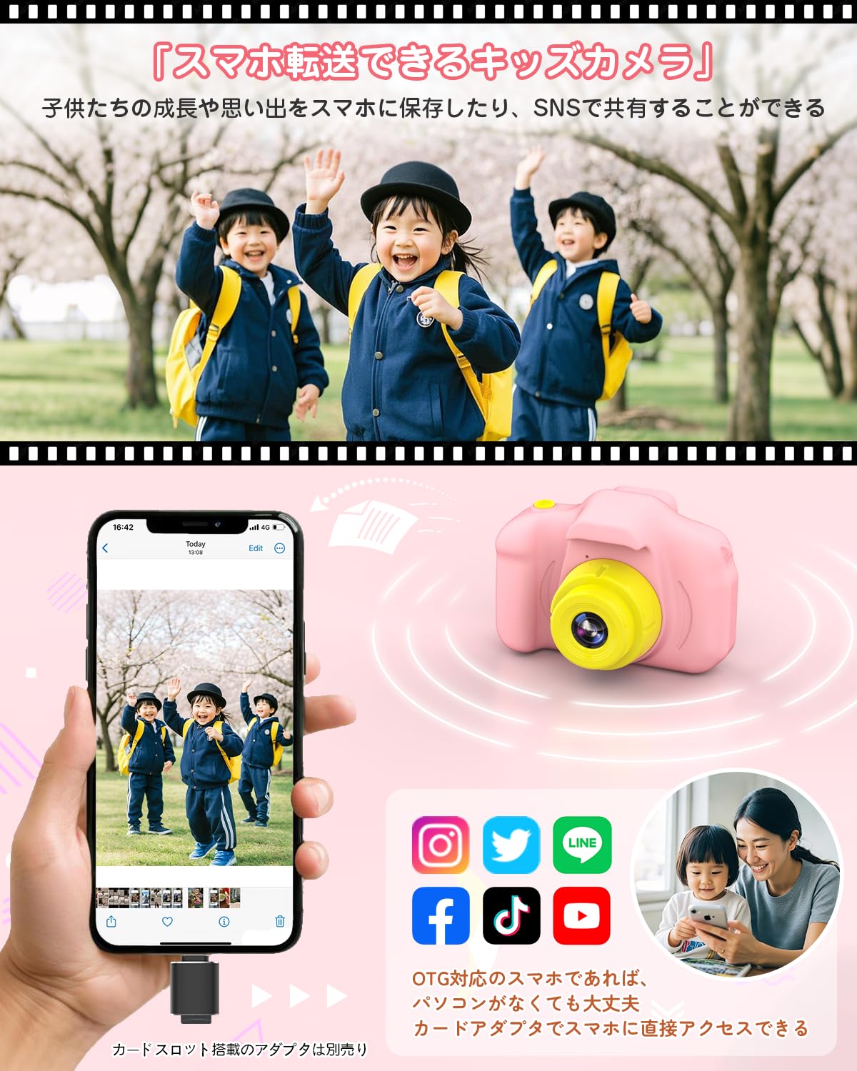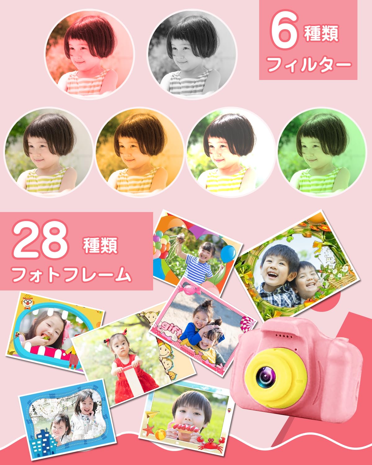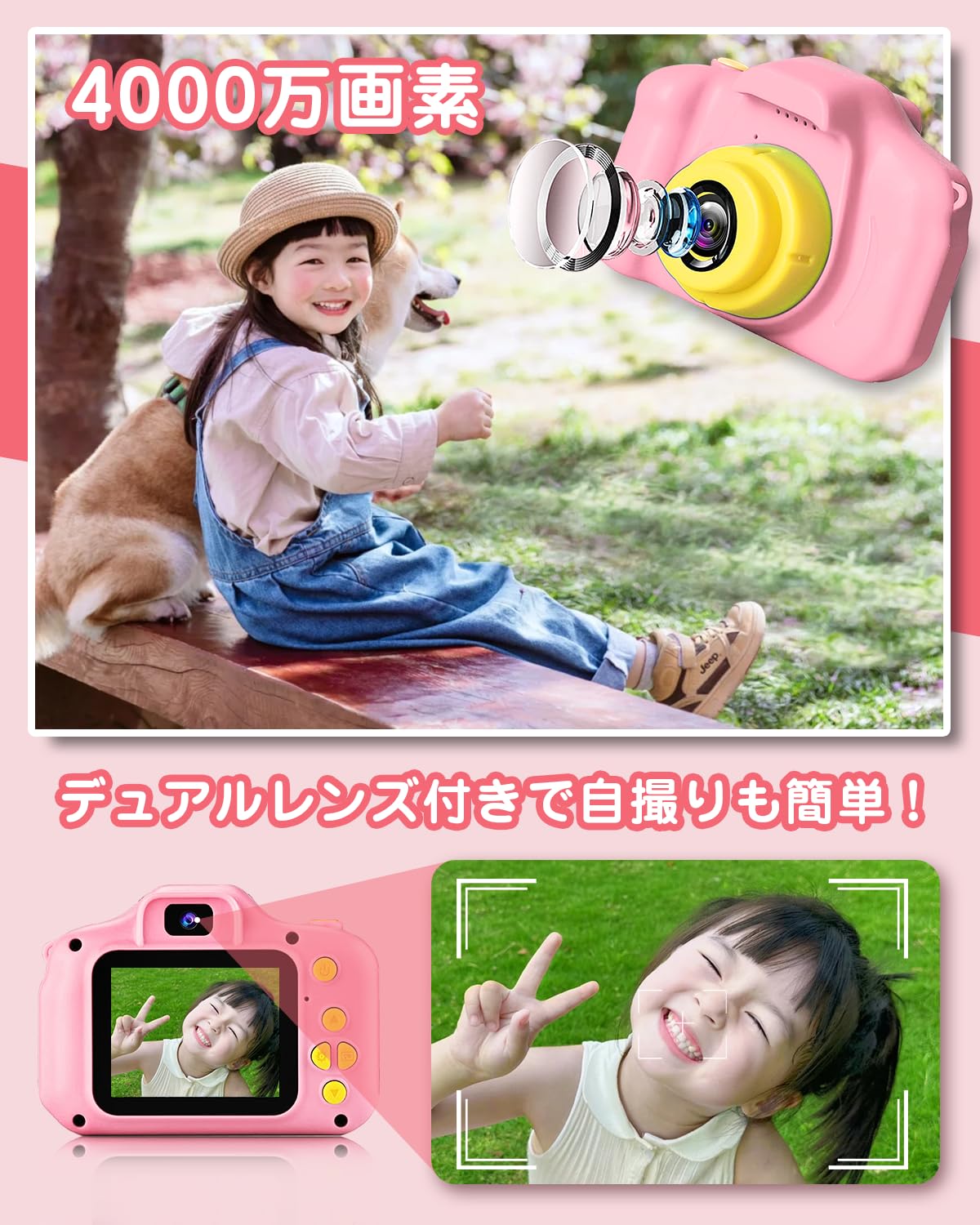 子ども 用 カメラ キッズカメラ 女の子 トイカメラ スマホ転送 3歳 4歳 5歳 女の子 誕生日 プレゼント 写真 動画 撮影 usb-c 充電 スマホ転送 32GBカード付 (桜色)
