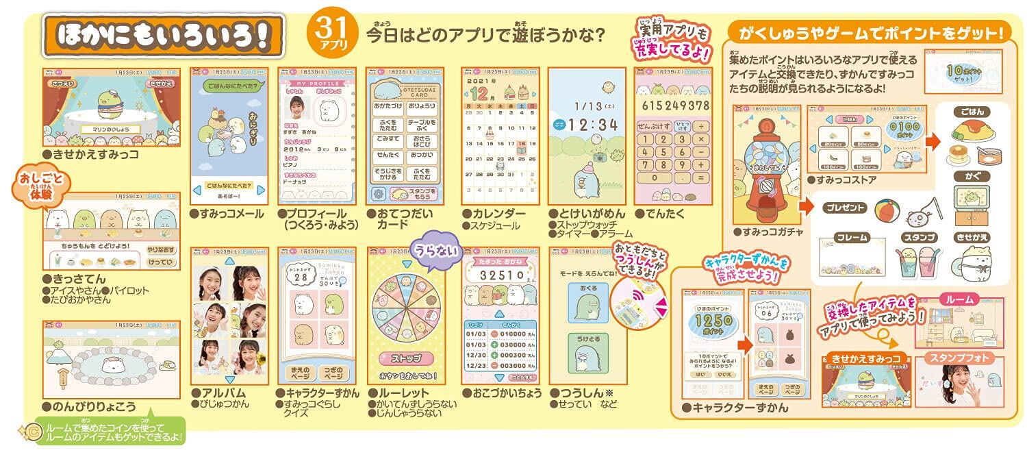 * 90アプリ、192メニューの充実した内容で、すみっコたちと遊びながら楽しくお勉強もできます。