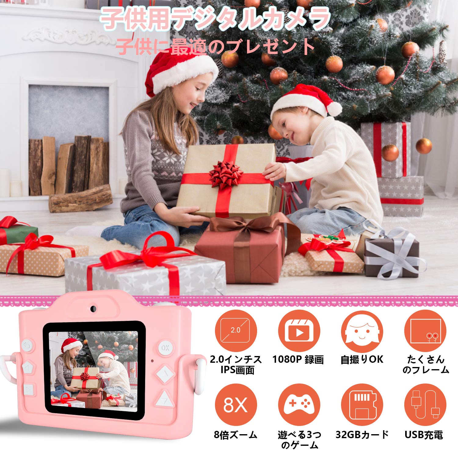 子供カメラ 子ども用デジタルカメラ トイカメラ 7000万画素 1080P HD録画 8倍ズームタイマー撮影 自撮可能 MP3 &ゲーム機能付き USB充電 32GBメモリーカード付き 子供のおもちゃ 子供プレゼント 年齢制限6+ (pink)