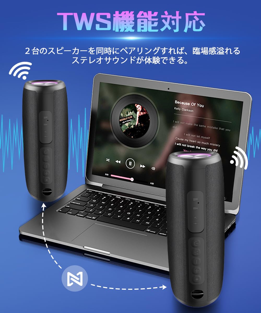 * 【Bluetooth 5.3接続&TWS機能対応】ワイヤレススピーカーは業界最新のBluetooth 5.3接続技術を利用して、安定した接続と迅速に高音質の伝送を実現します。最大の伝送距離も10mに達しています。また、ワイヤレススピーカーは幅広い交換性があり、パソコン、スマートフォン、iPad、テレビなど、すべてのBluetoothデバイスに簡単に接続できます。そして、ワイヤレススピーカーはTWS機能が搭載され、本機を2台同時に購入すれば、2台ペアリング機能で2つのスピーカーを同時にペアリングすれば、家でも映画館のような、臨場感溢れるステレオサウンドが体験できます。