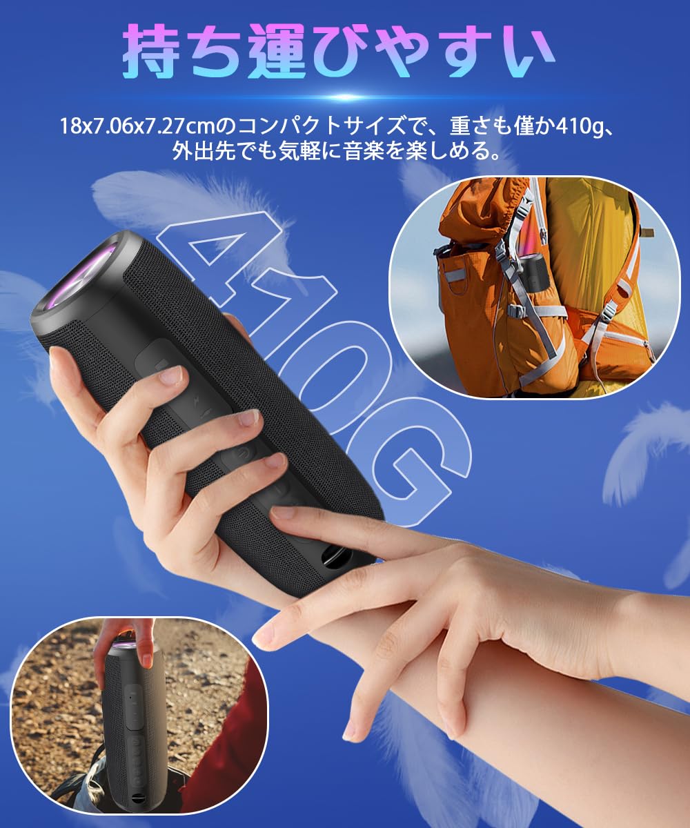 * 【Type C充電式&持ち運びやすい】ブルートゥース スピーカーはType C充電式なので、モバイルバッテリーやパソコンなどのUSBデバイスで簡単に充電できます。また、ブルートゥース スピーカーは18x7.06x7.27cmのコンパクトサイズで、重さも僅か410g、非常に小型で持ち運びやすいです。オフィス、アウトドア、家、車内など様々な場合に大活躍します。そして、ブルートゥース スピーカーはIPX7防水性能が備えるので、海やプールなど、お風呂場での利用も心配ありません。(※ご注意:ずっと水に完全に浸さないでください。)