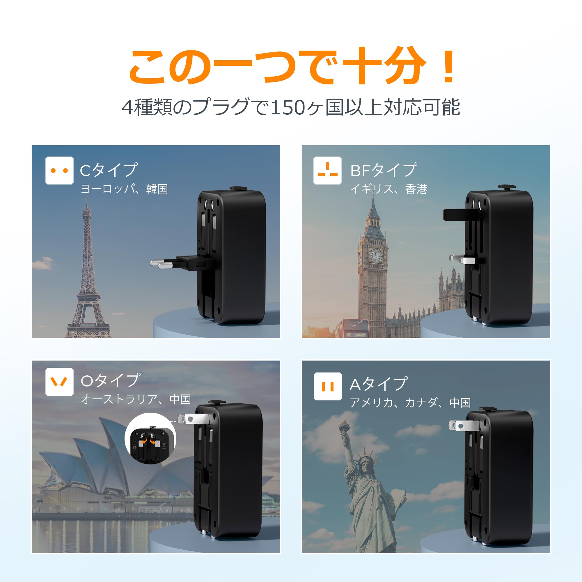 * 【変換プラグ 全世界対応】海外 変換プラグは、C・BF・O・A・タイプの海外コンセントに対応しており、旅先のプラグ形状にあわせて切り替えられるマルチタイプです。韓国、ヨーロッパ、オーストラリア、シンガポール、香港、イギリス、タイマレーシア、イタリア、フランス、中国、タイなど、全世界150カ国以上のプラグに対応します。