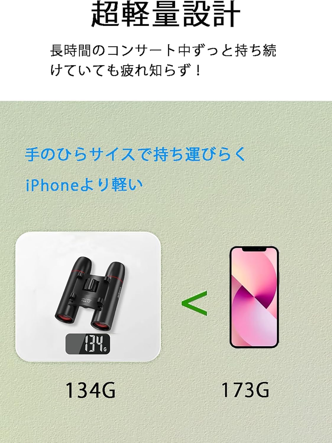 * ️【本体重量134gの超軽量を実現】 本体重量がわずか134gと超軽量でコンパクトな双眼鏡なので、コンサート、ドーム、ライブ、旅行のお供にもってこい女性やお子さんも長時間持っても疲れない