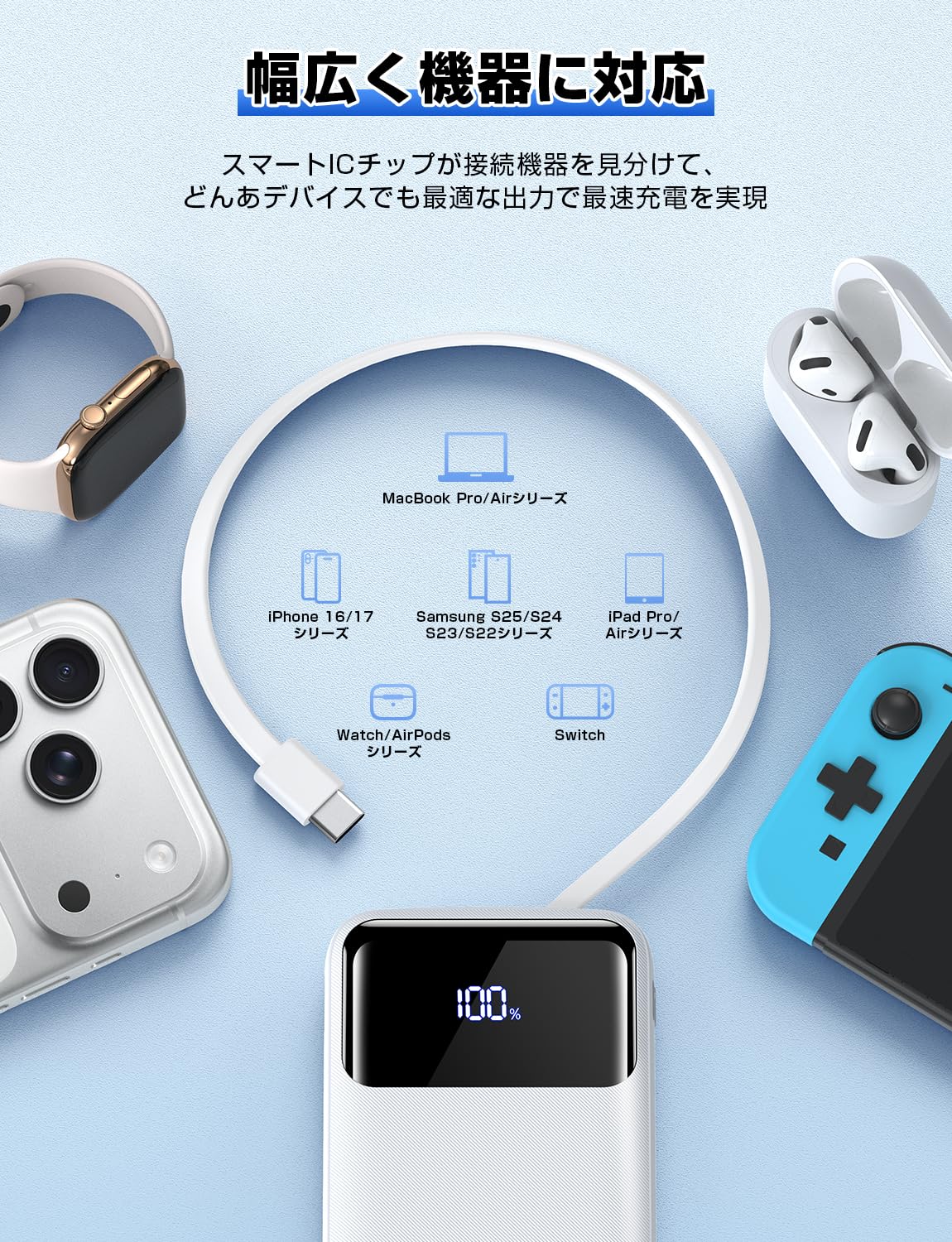 * 【4種ケーブル内蔵&着脱式設計|充電の“準備ストレス”をなくす一体型設計】外出先でモバイルバッテリーを使おうとした際に、「ケーブルを忘れた」「端子が合わない」「バッグの中で絡まっている」といった経験はありませんか。本製品は、そうした日常の小さなストレスを根本から解消するため、USB-A、Type-C、Micro-USB、Lightningの4種類の充電ケーブルを本体に内蔵した一体型設計を採用しています。スマートフォンはもちろん、イヤホン、モバイル機器、周辺デバイスまで幅広く対応でき、使用シーンごとにケーブルを選び直す必要がありません。さらに、内蔵ケーブルはすべて着脱式となっており、必要なケーブルだけを取り外して単体の充電ケーブルとして使用することも可能です。モバイルバッテリーとしてだけでなく、日常の充電アクセサリーとしても柔軟に活躍します。複数のケーブルを別々に持ち歩く煩わしさがなく、バッグの中もすっきり整理できるため、通勤・通学、出張、旅行など、持ち物を最小限に抑えたい方にも最適です。「これ1台あれば充電環境は整う」という安心感を、日常のあらゆるシーンで実感できる設計です。
