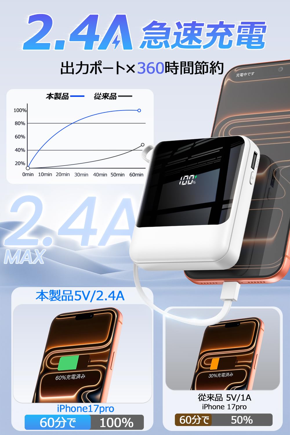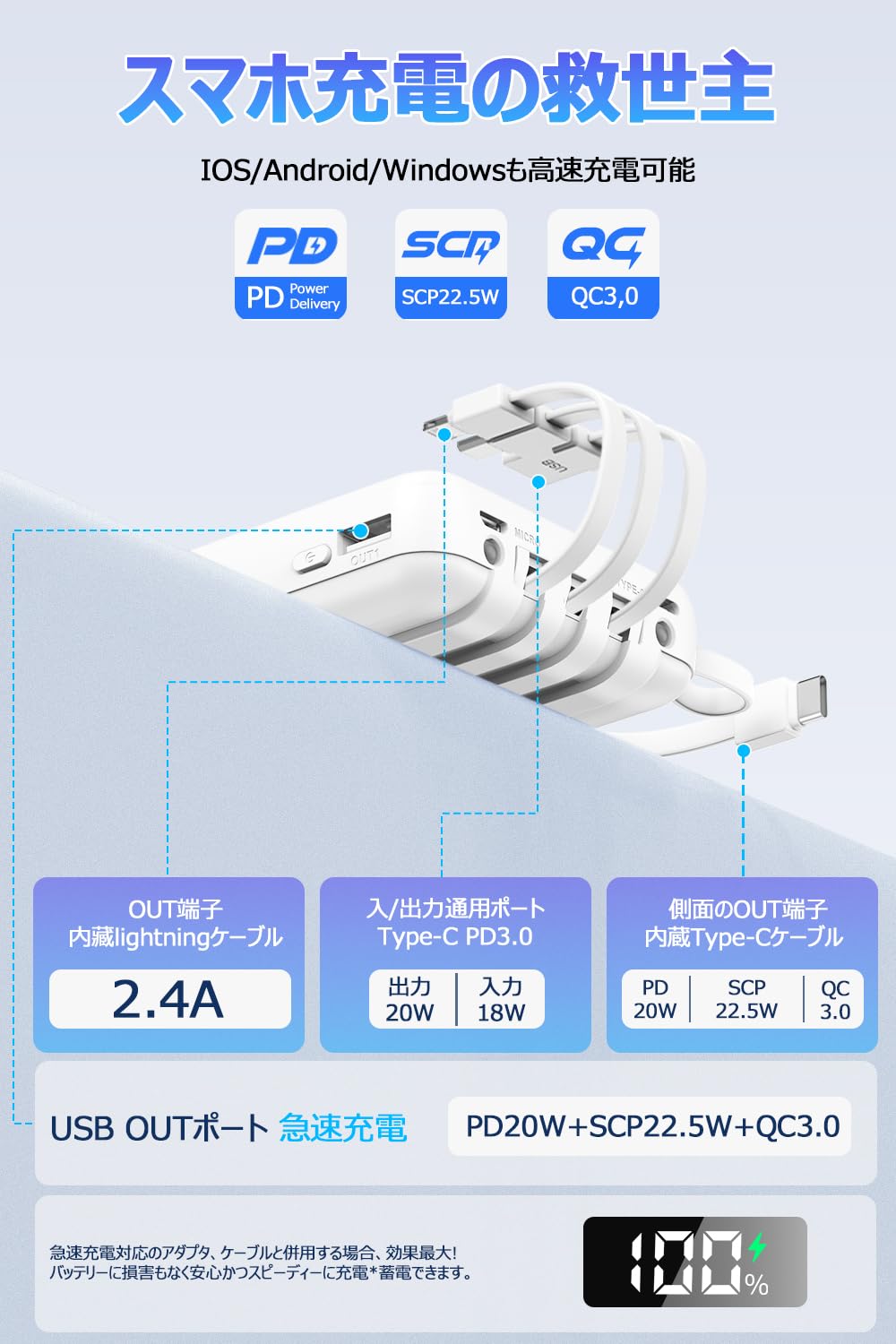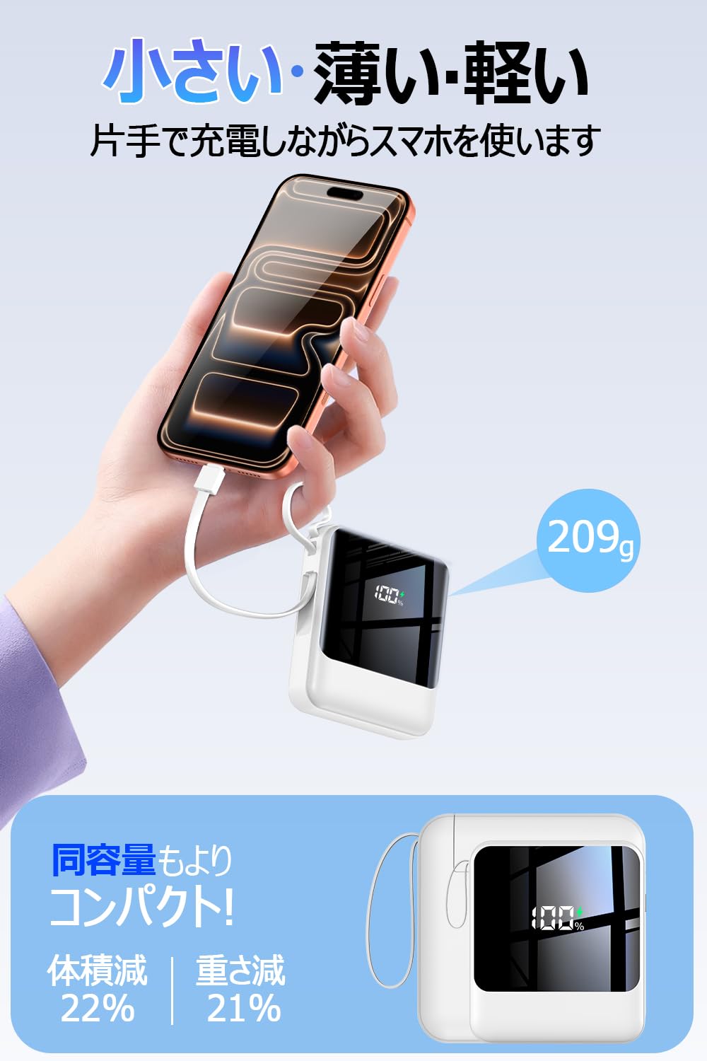 モバイルバッテリー 軽量 小型 22000mAh大容量 209g超軽量 22.5W/20W急速充電 モバイルバッテリー 大容量 4本ケーブル内蔵 急速充電 携帯充電器 USB-Type C入出力ポート 5台同時充電 LCD残量数字表示 スマホ充電器 コンパクト 持ち運び便利 機内持込可能 LEDライト付き PSE認証済 スマホ 全機種対応 電熱ベスト 新年プレゼント (ホワイト)