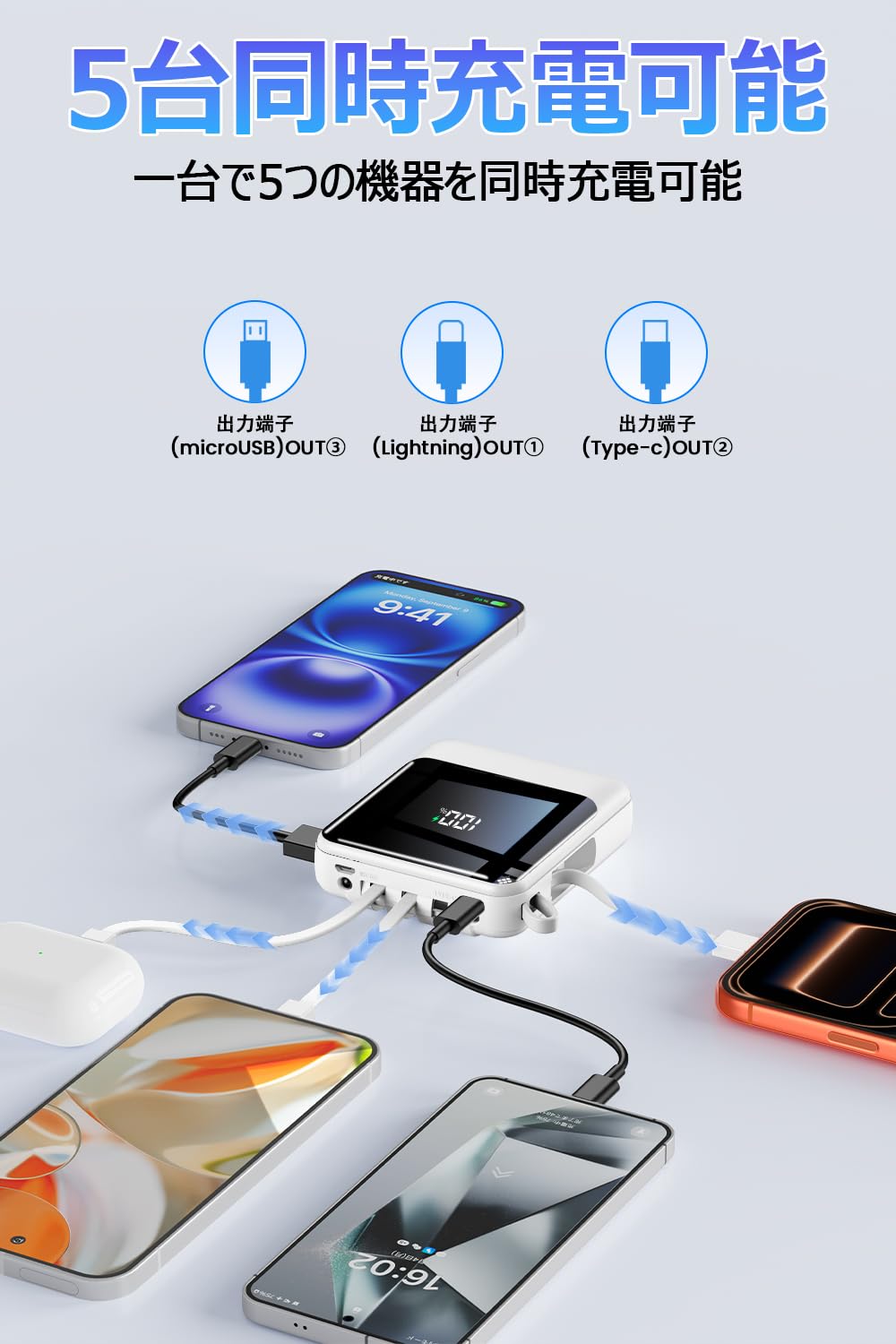 * 【2025業界新設計モバイルバッテリー!優れた実用性】外出するために設計された超軽量モバイルバッテリーが登場し、さまざまな煩わしい充電線を持ち込む必要がなく、モバイルバッテリーの内蔵ケーブルは出力と入力の需要を実現することができます。4本内蔵ケーブルで各種機器の充電も可能です。更に2個USB出力口付きで、最大5台の設備を同時に充電することもでき、友達家族と一緒にいるときは、必要に応じてみんなで充電することができます。携帯性を重視する方には、ケーブル内蔵型のモバイルバッテリーがおすすめです。外出する際の荷物が減らせるほか、自宅や訪問先にケーブルを置き忘れる心配がありません。必要なときに素早く引き出して充電できます。
