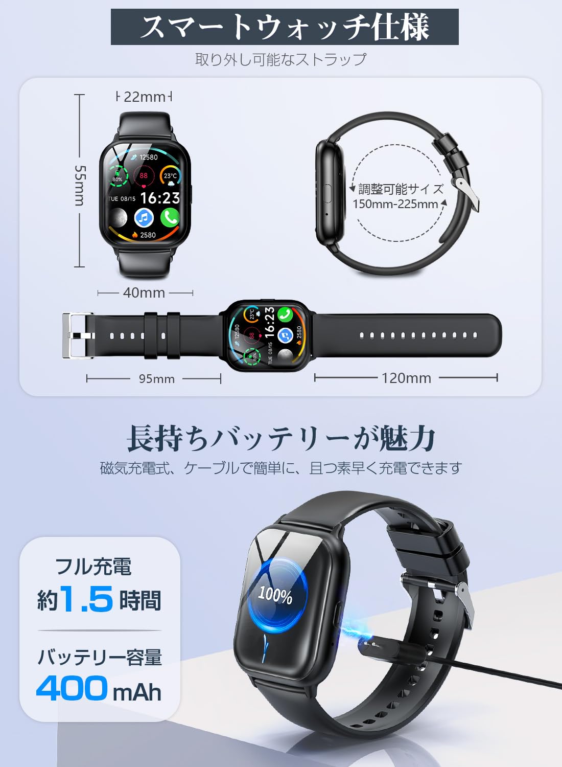 * 【1.9インチHD大画面・スムーズな操作性】️本製品は、240×284ピクセルの高解像度を誇る1.9インチのHD大画面を搭載。映像は鮮明で色彩豊か、広い視野で細部まで美しく表示します。指先にしっとりと馴染むスムーズなタッチ操作で、画面の切り替えも直感的。スマホのような軽快な操作性を体感できます。独自開発のOSを採用し、画面遷移が速く、誰でも簡単に扱えるユーザーフレンドリーな設計。着信、LINE、SMS、Twitterなどの通知をすべて手元で瞬時に確認でき、⏱️忙しい毎日も効率的にマネジメント。腕を上げるだけで画面が自動点灯する「手首検知」機能を備え、必要な情報がすぐ目に入るスマート設計。さらに専用アプリでは100種類以上の文字盤がワンタッチで変更でき、気分やシーンに合わせて自在にカスタマイズ可能です。