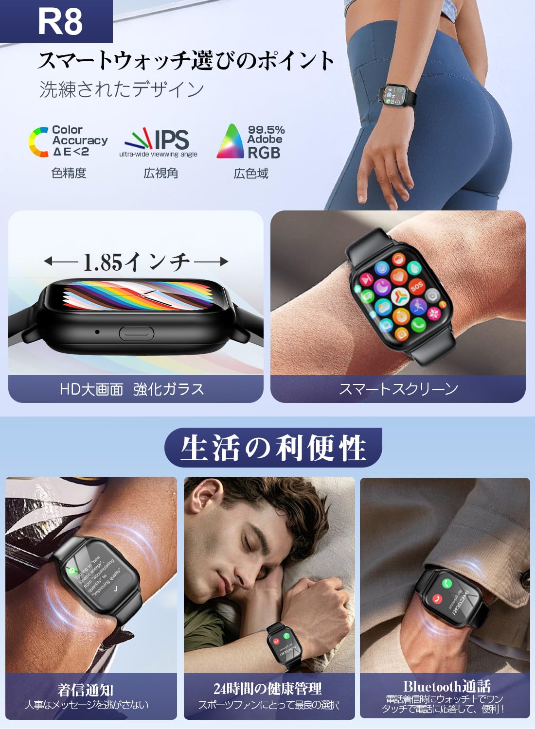 * 【2025年アップグレード性能モデル・精緻なデータ活用】最先端の2025年進化型パフォーマンスモデル「R8」は、革新的テクノロジーを搭載した多機能スマートデバイスとして、使用者の日々のデータを丁寧に記録・解析し、ライフスタイル全体を最適化するサポートを実現します。日常のリズムを整えたい方や、より豊かな毎日を目指す方に理想的な選択肢であり、歩数や消費カロリー、活動量など多様なデータを直感的に確認でき、あらゆる角度からデイリーコンディションを管理できます。⏱️また、自然に習慣化できるアクティビティ記録機能を備え、無理のない使い心地を追求。デザイン面では、ボーダレスな発想をもとに緻密に仕上げた曲面ガラスを採用し、繊細な翡翠のような光沢を放ちながら軽やかで高い表示性能を実現しています。フォーマルでもカジュアルでも馴染む洗練された雰囲気を持ち、上質な素材感と機能性を兼ね備えた本モデルは、あらゆるシーンでスタイリッシュに活躍します。