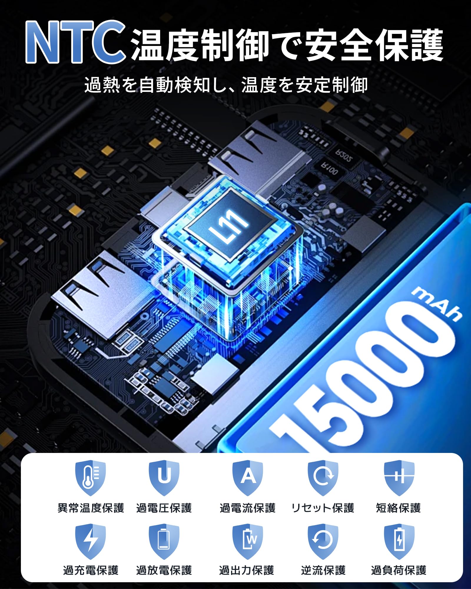 * 【 15000mAh安心の大容量&急速充電 】スマートフォンやタブレット、イヤホンなど、複数のデバイスを持ち歩くのが当たり前の時代。外出先でバッテリー切れになる不安を、この モバイルバッテリー が解消します。 15000mAhの大容量をわずか約200gの軽量ボディに凝縮、カバンやポケットに収まるスリムで持ち運びやすい設計の モバイルバッテリー です。スマートフォン約3回分、イヤホンや小型デバイスも繰り返し充電可能な 充電器 です。厚さ1.6cmのスリム設計で携帯性抜群、通勤・旅行・出張などあらゆるシーンで活躍する頼れる モバイルバッテリー タイプc です。