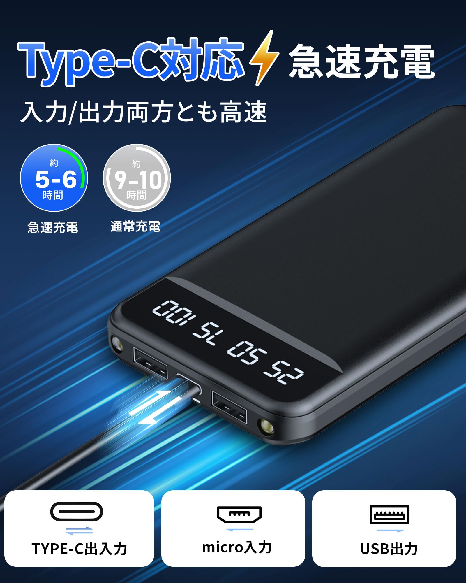 * 【高精度表示&多様なポート】 LEDデジタルディスプレイ&4段階インジケーターで残量を正確に確認可能な モバイルバッテリー 軽量 小型 です。残量を直感的に確認できるため、外出前や旅行中の充電計画が立てやすく非常に便利です。2つのUSB-A出力ポートとType-C入出力ポート、さらにmicro-B入力ポートを備え、最大3台のデバイスを同時に充電可能な cタイプ 充電器 です。Type-Cポートは最新の規格に対応しており、スマートフォン、タブレット、ワイヤレスイヤホンなど幅広い機器と高い互換性を持っています。充電ケーブル1本で入力・出力の両方に対応し、シーンに合わせて柔軟に使用できる使い勝手の良い設計です。