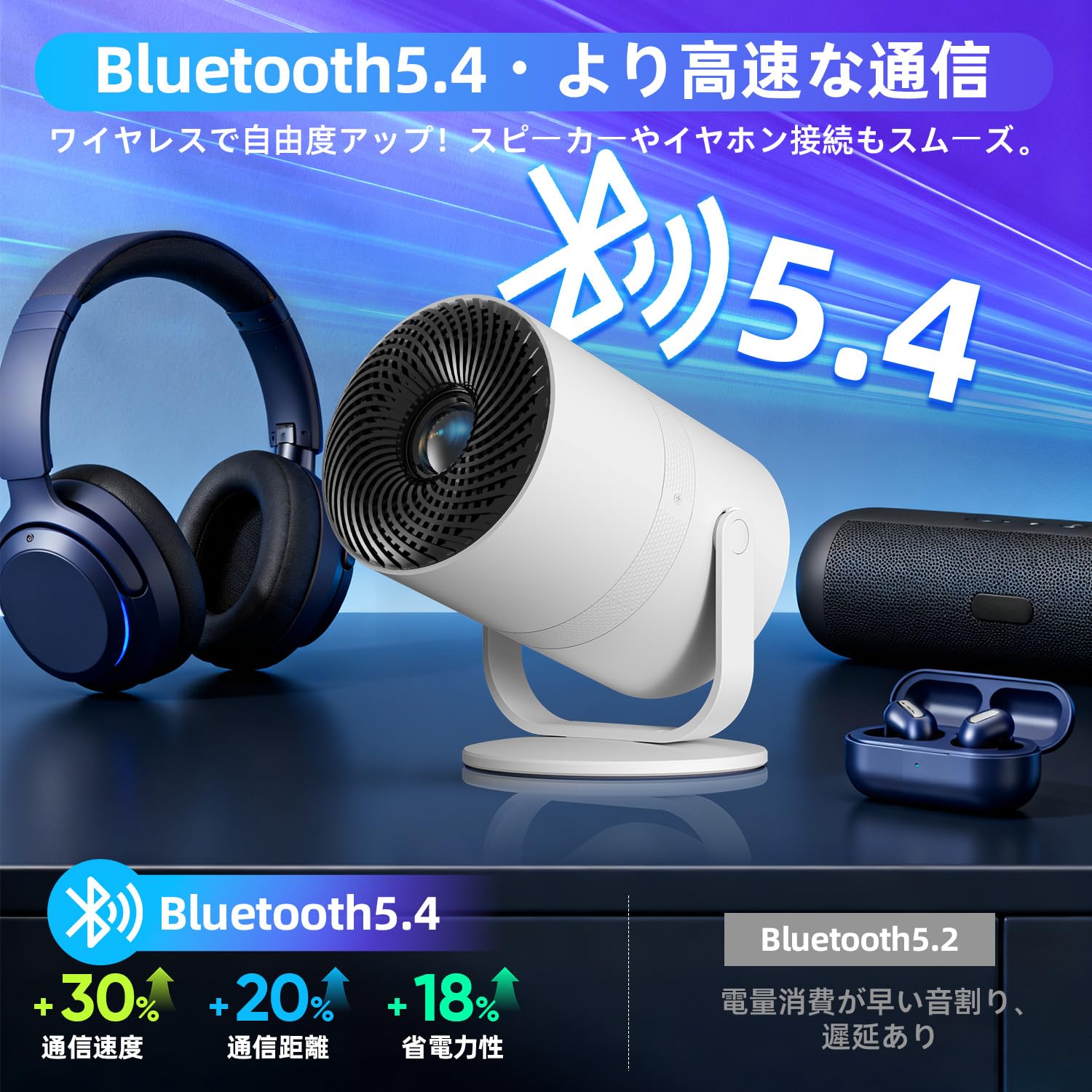 * 【Wi-Fi 6 & Bluetooth 5.4で高速接続・低遅延を実現】現代のマルチデバイス環境において、安定した接続性は不可欠です。このホームプロジェクターは最新のWi-Fi 6規格を採用。動画ストリーミングが従来より格段に高速で安定し、高画質な動画やゲームを楽しむ際の読み込み待ちや途切れ、遅延を大幅に軽減します。さらにBluetooth 5.4を搭載。ワイヤレスイヤホンや外部スピーカーとの接続がより低遅延で信頼性高く行え、深夜の視聴や大音量での再生時にも周囲を気にせず、没入感のあるサウンドを楽しめます。内蔵の高品質スピーカーでも十分な音響性能を発揮しますが、お好みのオーディオ機器と簡単に接続し、ホームシアター級のサウンド体験をカスタマイズできるのも特長です。スマートフォンやタブレット、PCとの画面ミラーリングもスムーズ。ビジネスプレゼンから家族での写真共有まで、多彩なシーンで活用できる、柔軟で高性能な接続性を備えています。