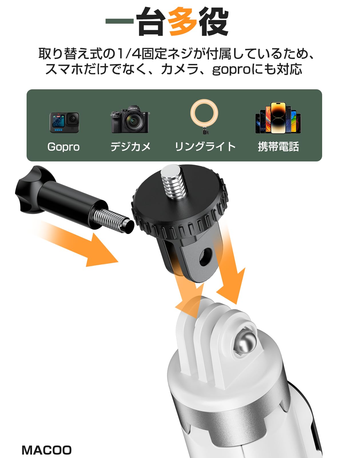* 【安定性を新たな次元へ】長年にわたり、MACOOは新設計と安定性を一体にした自撮り棒を追求し続けます。業界初「四脚安定モデル」自撮り棒がついに新登場へ!従来の三脚式じどり棒と異なる、安定感が高い「四つ脚」と「加強レバー」を施すことにより、ダブル安定構造で耐荷重が高かったのは20kg、iphone proシリーズや重いカメラなどに接続してもOK!更に底部はシリコンバンドが付き、滑りやすい環境でも、風が吹いていても、不安定な岩場でも安定した撮影ができます。
