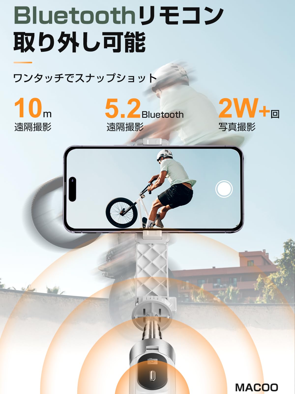 * 【業界トップチップBluetooth5.2、瞬間接続】Bluetooth接続タイプの自撮り棒は主流となりつつあるが、市販商品は接続不安定な悩みに困っています。MACOOセルカ棒は業界最先端Bluetooth5.2技術を採用、3秒に瞬間接続可能、一度接続したスマホをリモコンが自動記憶して、次回から自動的にペアリングできます。約10m先から遠隔撮影可能、旅先やパーティなどみんなでポーズをとって撮影したい場合は、MACOO自 撮り 棒は欠かせない1つとなっています。