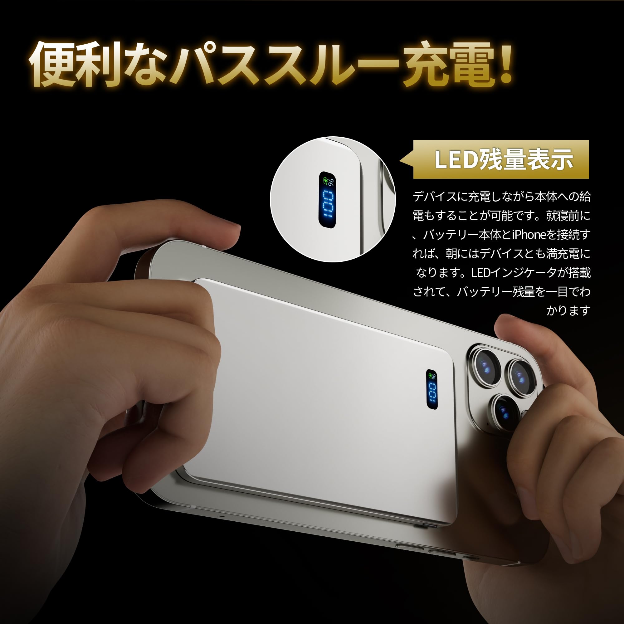 * 【LED残量表示】デバイスに充電しながら本体への給電もすることが可能です。就寝前に、バッテリー本体とiPhoneを接続すれば、朝にはデバイスとも満充電になります。LEDインジケータが搭載されて、バッテリー残量を一目でわかります。