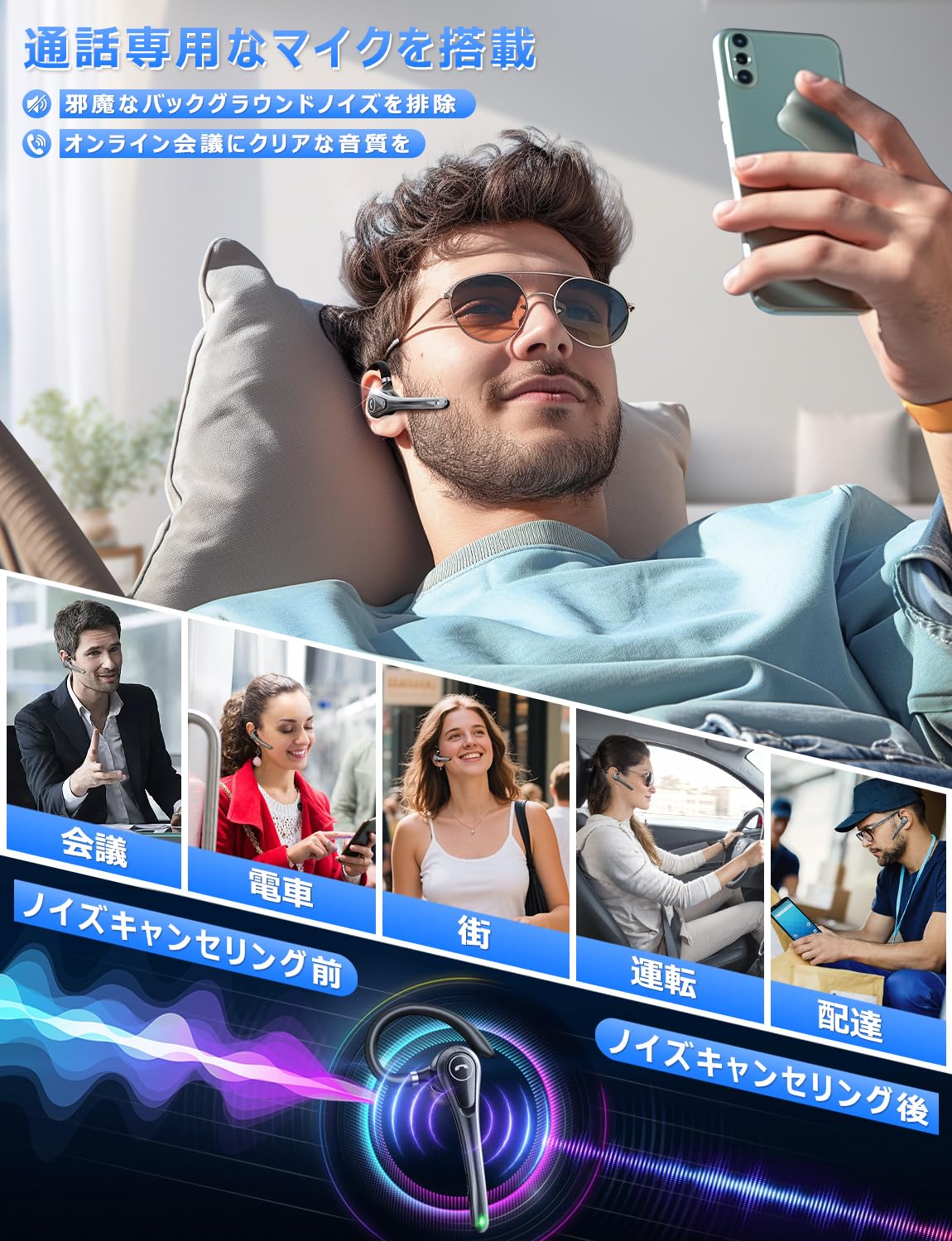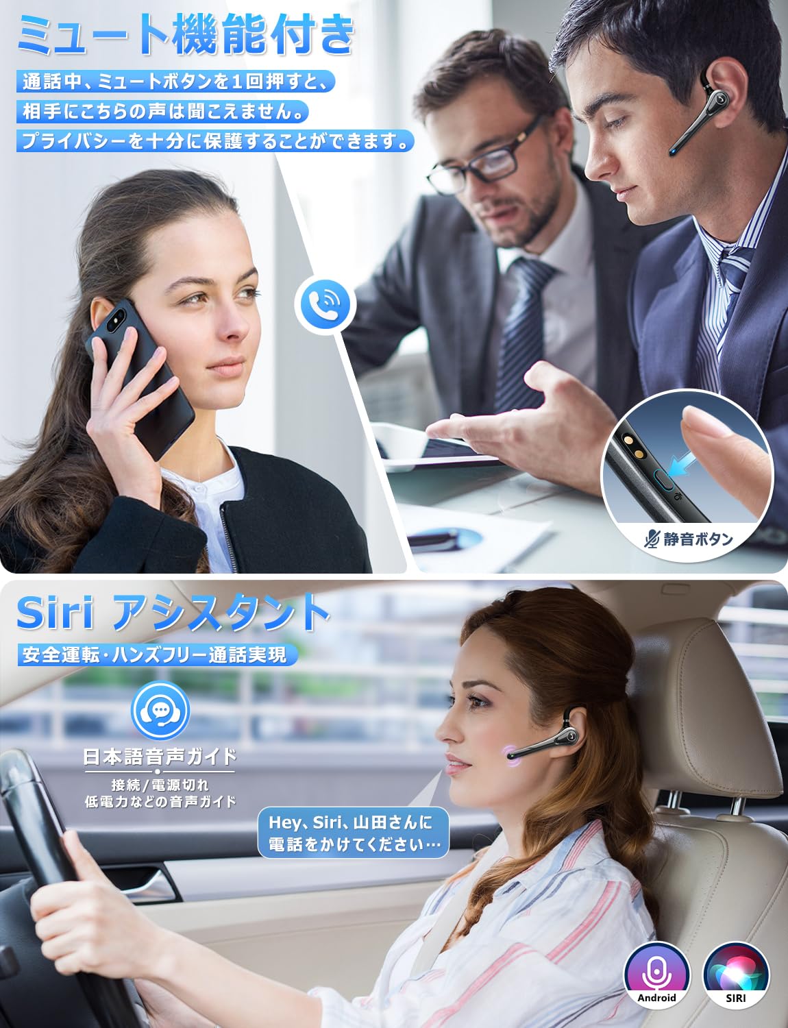* 【特化した単一指向性マイク・CVC8.0ノイズキャンセリング・ミュート機能搭載】弊社の片耳bluetoothイヤホンには単一指向性マイクが内蔵されていて、聴き取りやすいだけではなく、周囲の騒音やノイズを拾いにくく、相手にクリアで完璧な音声を届けることができます。それに、本製品はCVC8.0のノイズキャンセリング機能を搭載することで、電車や航空機などの走行音、風の音や周囲の話し声などさまざまな状況でも雑音による不快感を強力軽減してイヤホンの音がクリアに聞こえます。勉強や仕事などで集中力を高めたい人におすすめです。また、個人のプライバシーを保護するために、ミュート機能も搭載されており、通話中、「ミュートボタン」を1回短押すと、こちらの声は相手に聞こえなくなり、会議中など機密情報を扱う場合、中ウェブ会議に家族に話しかけられてしまったり、宅配便などが届いた場合は大変便利です。さらに、SIRIなどの音声アシスタント機能にも対応しており、運転中や作業中にも音声コントロールが可能です。これにより、日常の様々なシーンで、手を自由に使える便利さを実感いただけます。
