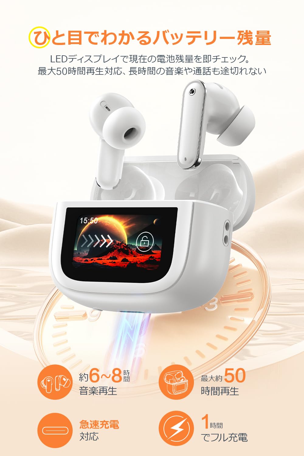 イヤホン bluetooth ワイヤレスイヤホン 【2025年最先端Bluetooth6.0 多機能タッチスクリーン・ANC対応】 ぶるーとぅーす ブルートゥースイヤホン 最大50時間再生時間 蓋を開けたら瞬間接続 自動ペアリング HiFi音質 Type-C急速充電 イヤフォン 小型 ENCノイズキャンセリング 左右分離型 ゲームモード IPX7防水 技適認証済