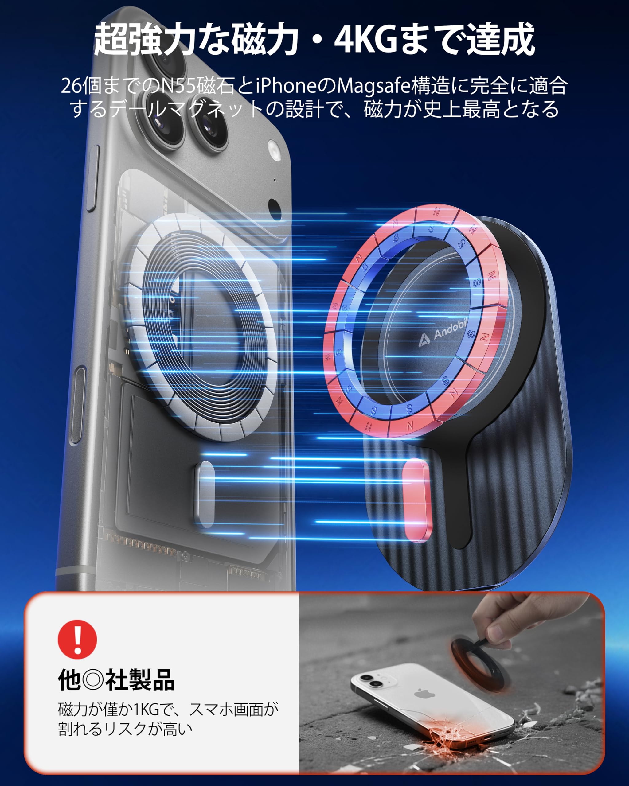 * 【磁力4KGの実現&新たな基準を打ち立てる】 多くのお客様から、購入したバンカーリングのマグネットの磁力が弱く、新品スマホの画面が割れて自腹で修理するケースがあるとのフィードバックをいただきました。この問題を回避するため、AndobilのMagGrip Proは高品質のN55磁石を採用し、しかも、磁石の数は26個までに達しています。また、MagGrip Proにはテールマグネットを追加し、磁石の配置をiPhoneのMagSafe構造の「I」部分と「O」部分と完全適応させて、磁力が4KGまで達成、業界全体に新たな基準を打ち立てました。これは、N52磁石を20個しか使わなず、磁力が僅か2KGの従来型と比べ、スマホ落下の心配を完全に解消します。また、スマホを保護するため、製品の吸着部分にはシリコンを配置して、一般的なiPhone リングで起こりがちな「スマホにキズがつく」問題を解決し、iPhoneをケースなしで使うユーザーでも安心してご利用いただけます。