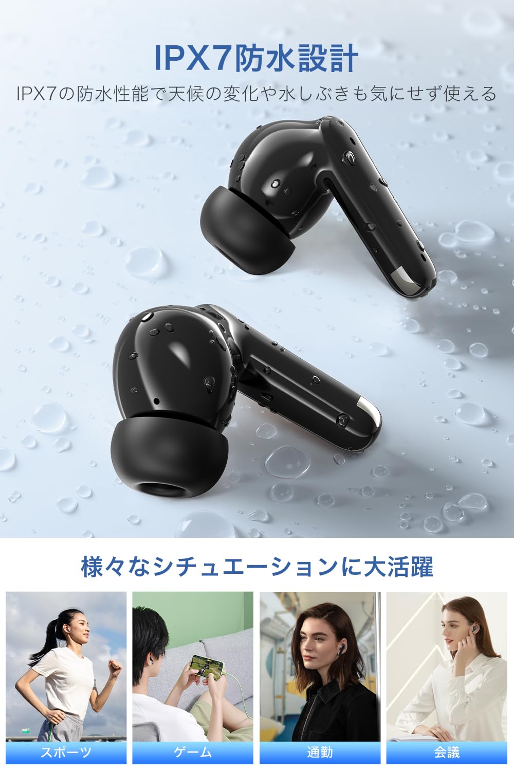 * 【IPX7防水&直感的タッチ操作で日常からスポーツまで活躍】IPX7防水仕様を採用し、汗や雨にも強く、スポーツやアウトドアでも安心。ランニング・登山・ジムでの使用はもちろん、急な雨の日でも問題なく使える頼れる設計です。さらに直感的なスマートタッチコントロールを搭載し、応答・拒否・再生・一時停止・音量調整・曲送り・曲戻し、Siri呼び出しまで簡単操作。手元を煩わせず、日常生活をより便利にサポートします。ワイヤレスイヤホンの利便性に防水性と操作性を兼ね備えた完全ぶるーとぅーすイヤホンで、毎日の音楽体験をワンランクアップさせます。