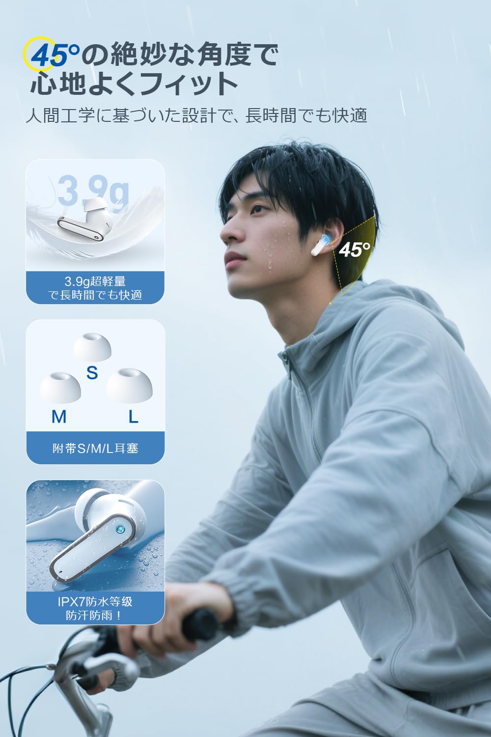 * 【最大50時間再生、IPX7防水&超軽量設計でスポーツ・通勤・通学・WEB会議にも最適】 イヤホン bluetooth本体は約6〜8時間、充電ケース併用で最大50時間再生。LEDディスプレイで現在のイヤホンと充電ケースのバッテリー残量がひと目で確認可能。わずか3.9gの超軽量設計と45°人体工学フィットにより、長時間使用でも疲れにくい快適な装着感を実現。さらにIPX7防水仕様で、汗をかくジムやランニング、突然の雨の中でも安心。 スポーツ/通勤/通学/WEB会議など毎日のさまざまなシーンで頼れるワイヤレスイヤホンとして活躍します。