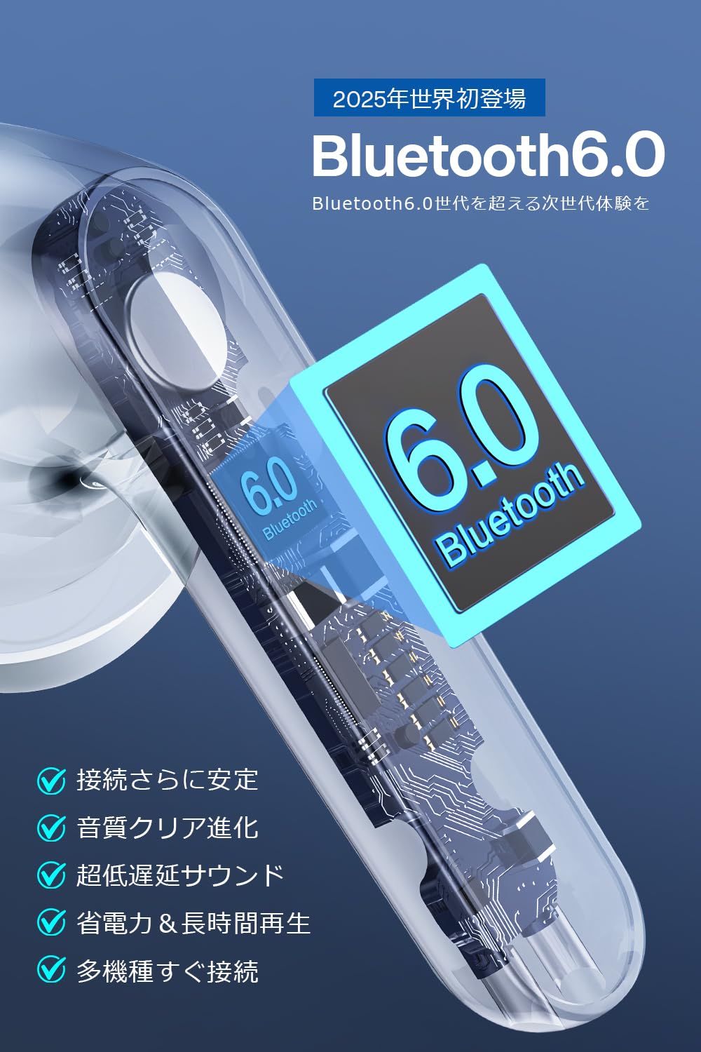 * 【世界初Bluetooth6.0搭載、より安定した接続と低遅延でワイヤレス体験を進化】 2025年世界初登場Bluetooth6.0を搭載。駅や通勤・通学中の人混み、混雑したオフィスでもイヤホン bluetooth接続は途切れず、常に快適。超低遅延によりYouTube・映画・ゲームでは映像と音声がピッタリ同期、WEB会議でも音ズレの心配がありません。 さらに省電力設計で最大50時間再生を実現。スマホ・PC・タブレットとのマルチデバイス接続にも対応し、朝から夜までワイヤレスイヤホンの自由な使い心地を楽しめます。