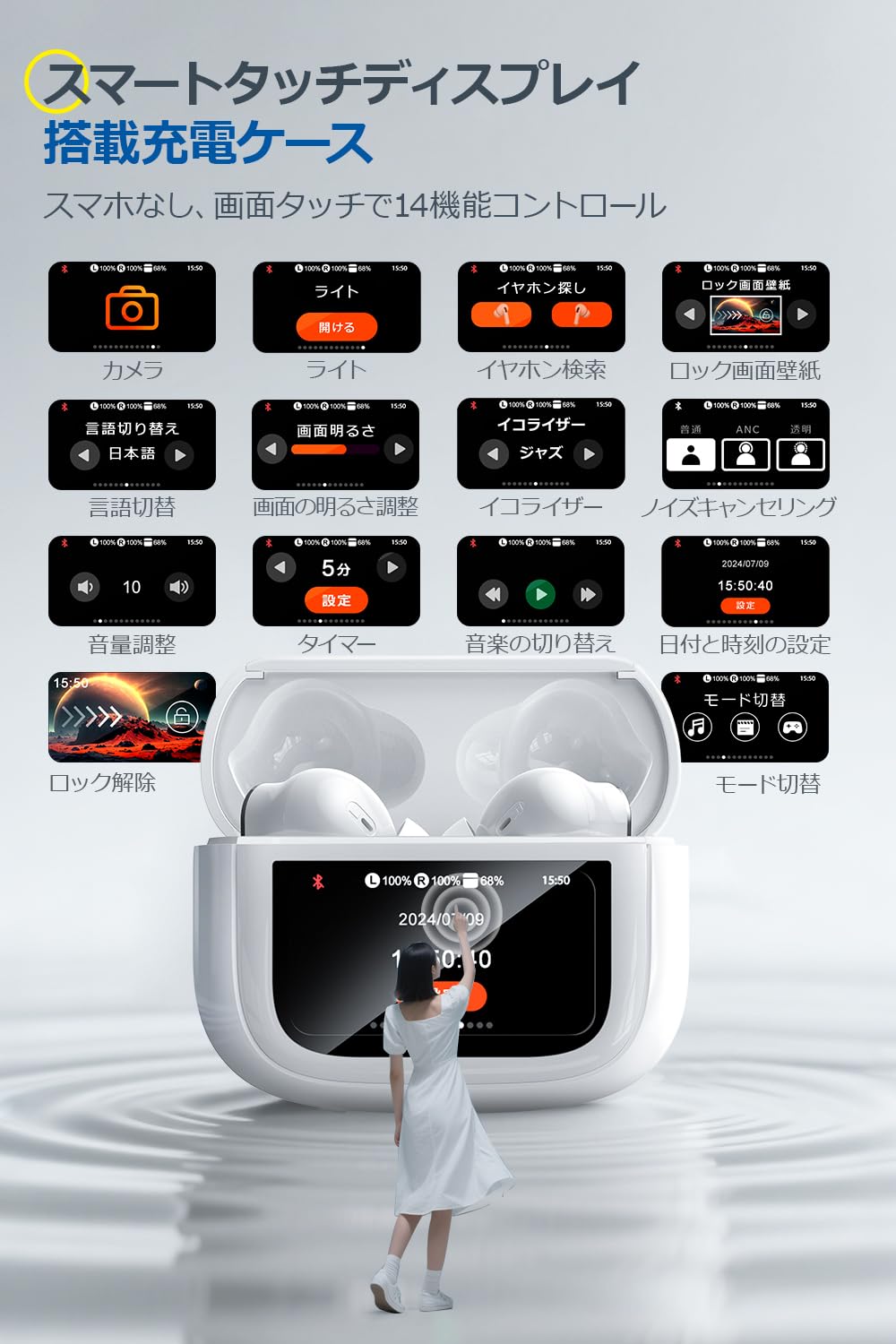 * 【スマートタッチケース、14機能簡単操作でイヤホン探しも安心】 従来のワイヤレスイヤホンケースとは違い、スマートタッチディスプレイ搭載充電ケースを採用。スマホなしで14機能(音楽切替/ノイズキャンセリング/外音取込/音量調整/イヤホン探し/イコライザー設定/ロック画面壁紙/ライト点灯/タイマー/画面明るさ調整/言語切替/日時設定/ロック解除/バッテリー残量表示)をサッと操作可能。 イヤホン探し機能で万が一紛失しても安心。通勤電車内やスポーツ中でもケースだけで直感操作でき、小型/軽量なデザインで携帯性も抜群。毎日の使い心地が格段に向上します。