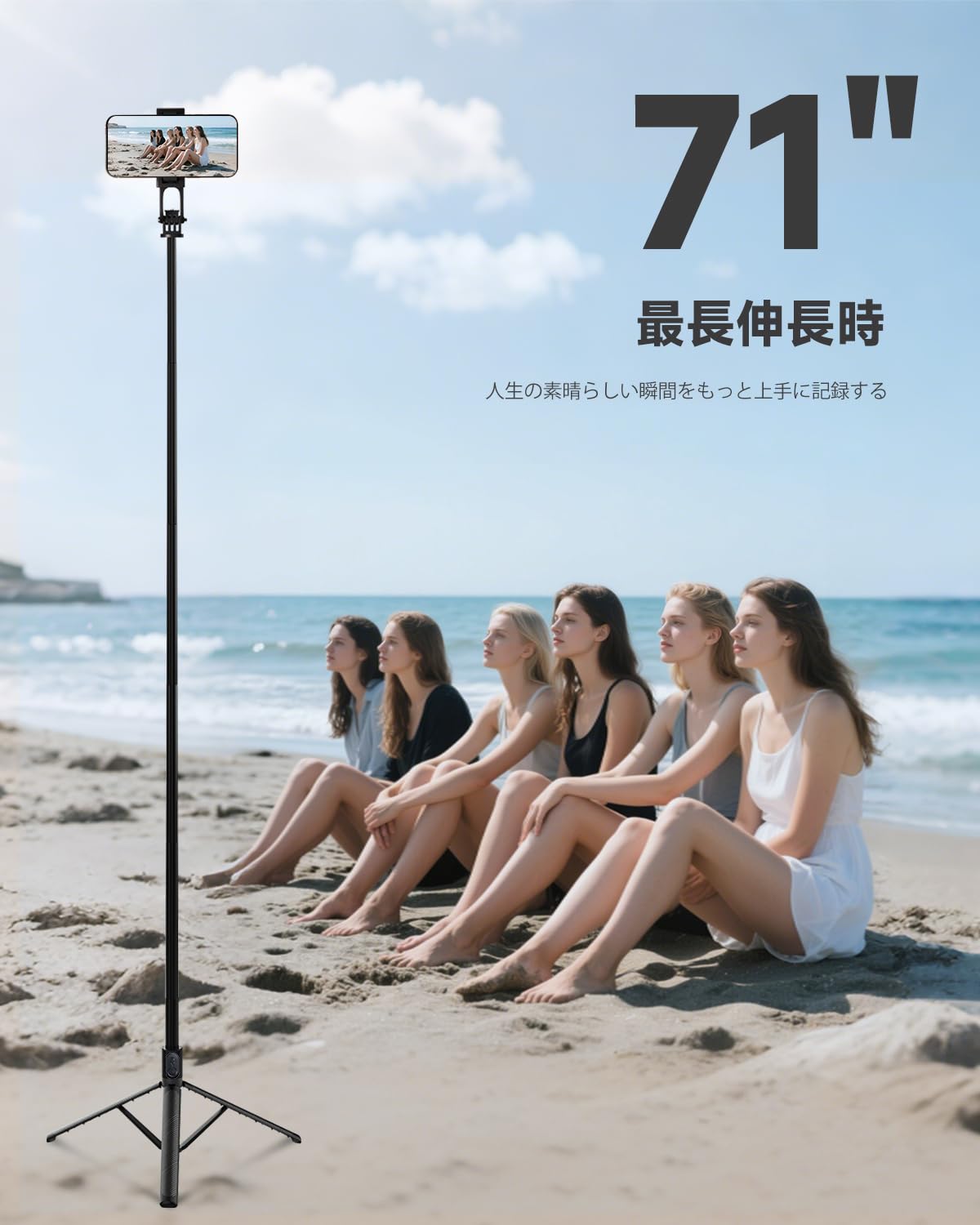 * [多機能デザイン] RISEOFLE 71インチ(180cm)スマホ三脚&自撮り棒は、あらゆるスマホ撮影のニーズに応える完璧な相棒です。高品質なアルミニウム合金製の伸縮ポールは軽快に伸縮し、ワンタッチで三脚に早変わり。頑丈かつ軽量な設計で安定性と信頼性を提供し、使用中のスマホやカメラを確実に守ります。自撮り/ライブ配信/動画撮影/旅行に最適です。