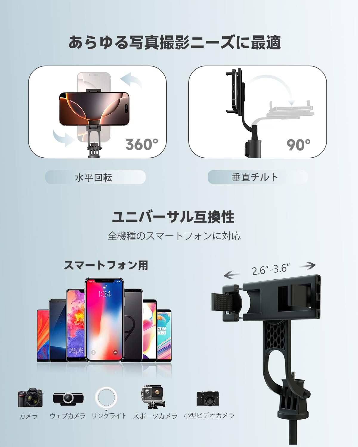 * [360°回転 & 幅広い互換性] 360°回転するスマホホルダー搭載で、縦向き/横向きを簡単に切り替え、最適な画角で撮影できます。ユニバーサルホルダーは幅約6.6cm~9.1cm(画面サイズ4~7インチ)のスマートフォンに対応。さらに1/4インチネジマウントにより、ほとんどのカメラ、アクションカム、ウェブカムにも取り付け可能です(※リモコン機能はスマートフォンのみ対応、カメラではご利用いただけません)。
