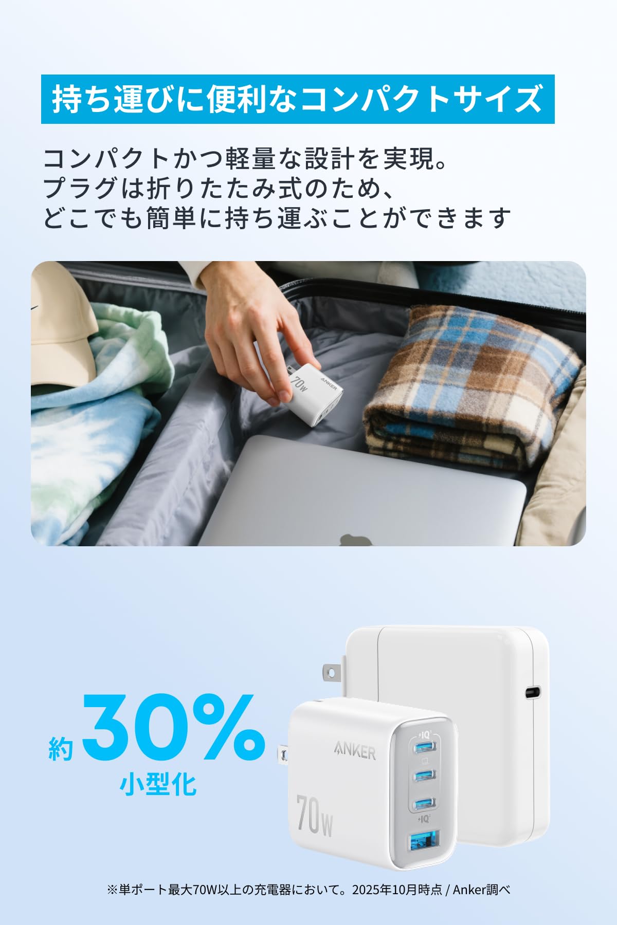 * MacBook Airを急速充電:単ポート最大70W出力に対応。スマホやタブレットはもちろん、MacBook Airにも急速充電が可能です。