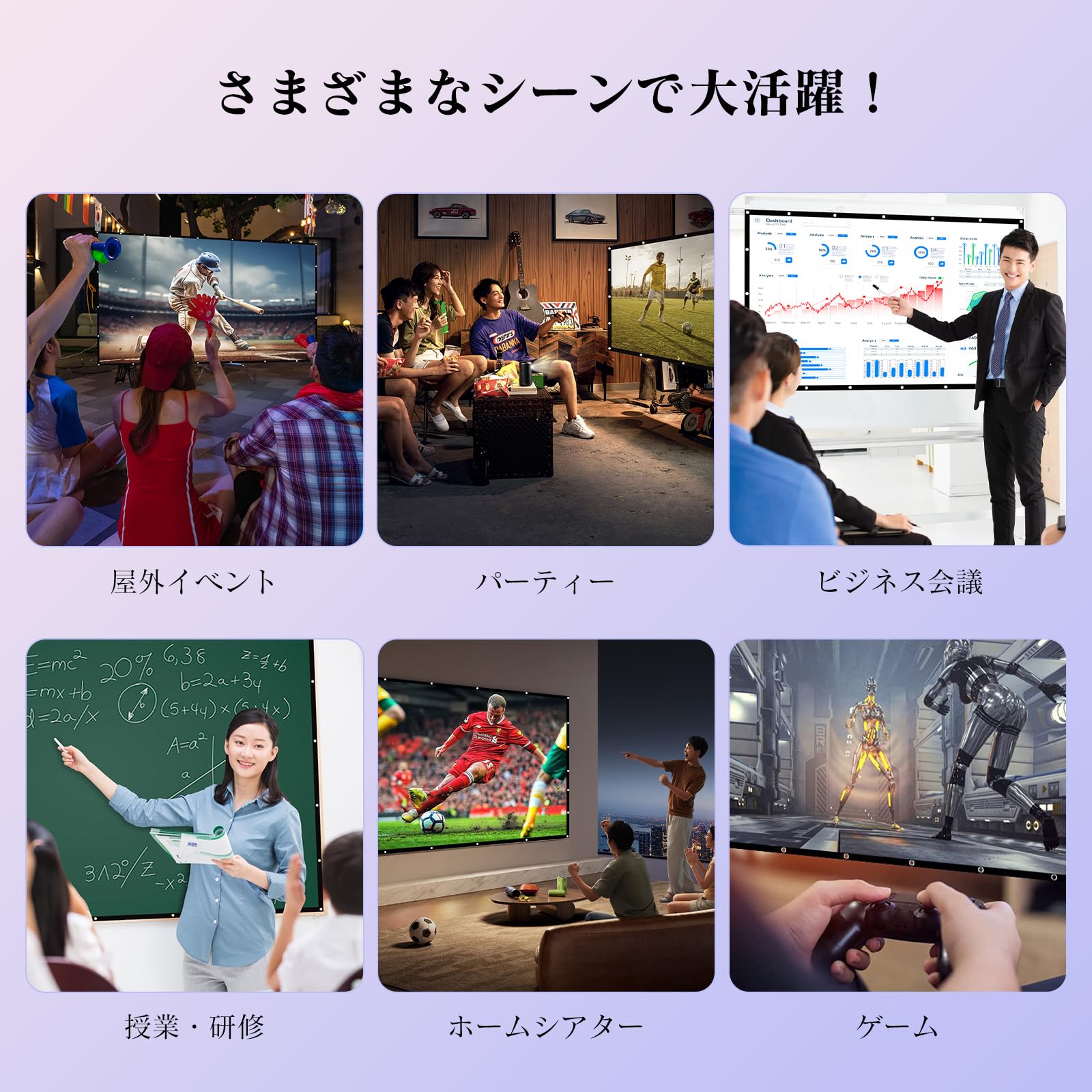 * 【5分設置&持ち運び便利!どこでも使える万能スクリーン】フック・ロープ・両面テープなど設置に必要なアクセサリーをすべて付属。わずか5分で簡単に取り付けでき、誰でも手軽にシアター空間を演出できます。折りたたみ式&軽量で持ち運びもラクラク。リビング・会議室・教室からキャンプ場まで、Salangeスクリーンはどんな場所でも大活躍します。