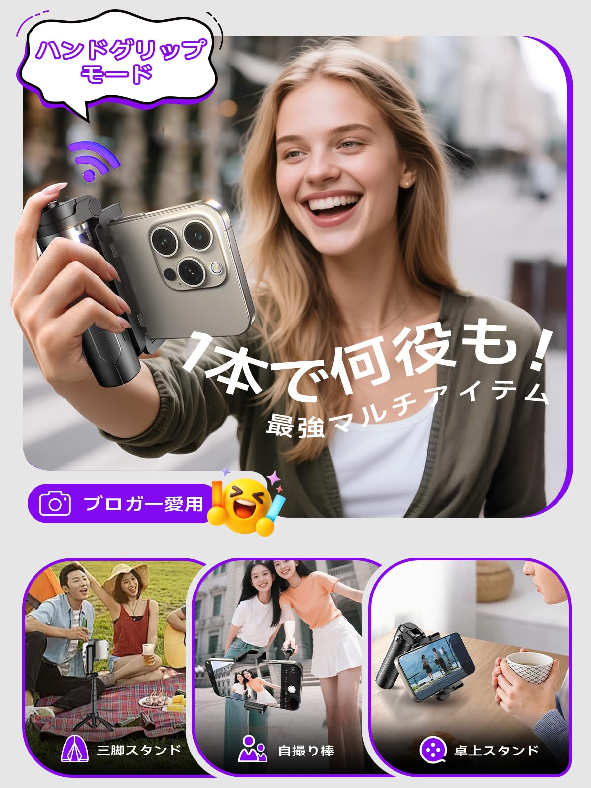 * 【ダブル安定四脚・1秒展開】お客様の声に応え、携帯性を損なわずに安定性を大幅強化!4本の高安定性脚と補強バーによるダブル安定構造で、強風や不安定な地面でも揺れを抑えます。自撮り棒の底部ボタンを押すだけで1秒でパッと開き、すぐに三脚スタイルに変身。荷物が多い旅行先や人混みの中でも、素早く安定して撮影可能。