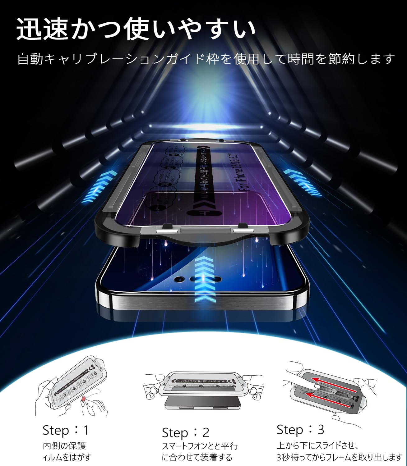 * 【自動位置決めガイド枠付き、超簡単貼り付け】後面フィルムを剥がしてから貼り付けガイド枠と画面が平行になるように装着し、矢印に従ってフィルムを押し、3秒待つだけで貼り付けが完了です。位置合わせ不要、まっすぐピタッと一発成功。いphone16 携帯フィルムには自動吸着技術が搭載されているため、貼り付け後も気泡ゼロ。仮に気泡が出てきたとしても、ちょっとした作業で消えてしまいます! 初心者の方でも簡単に貼ることができます。