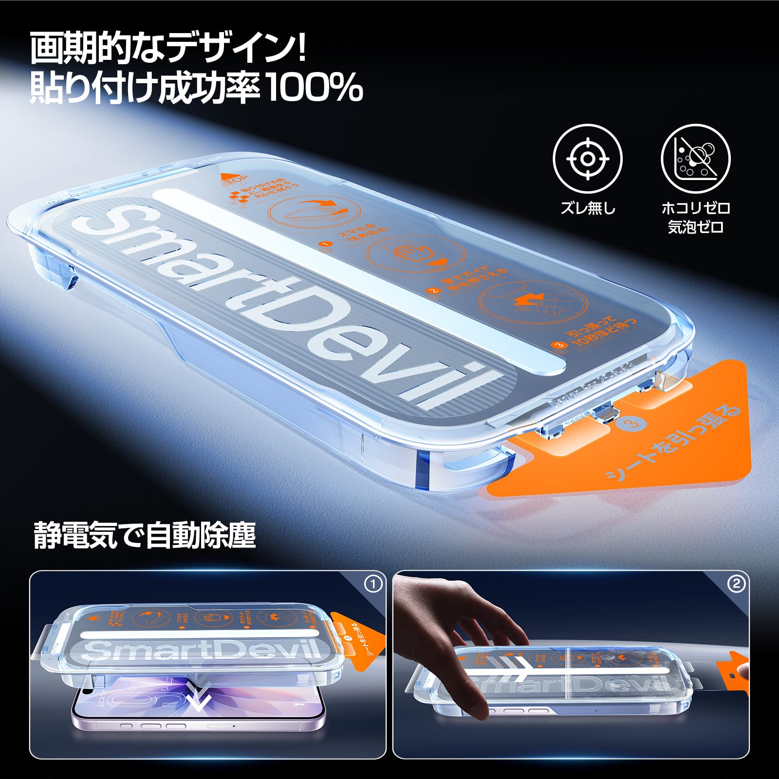* 【自動除塵・3秒で完成】画期的なガイド枠です!除塵シートを引くだけで、自動で埃が除去され、貼った後は気泡が残りにくいです。2ステップだけで簡単に貼り付け!ガイド枠をスマホに被せて、除塵シートを引っ張ると貼り付け完了です!