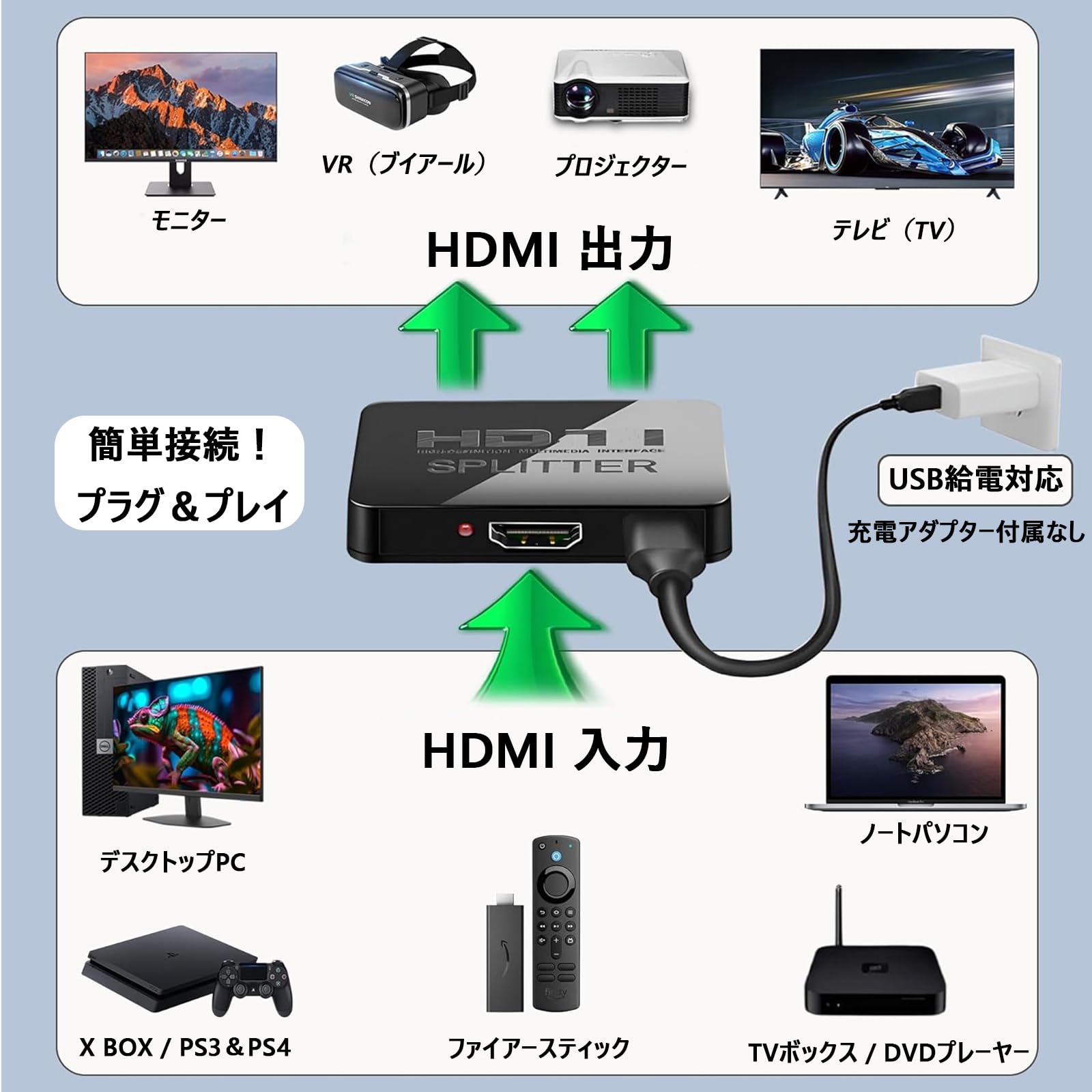 * 【 プラグアンドプレイ&コンパクト設計】当社のHDMIスプリッター(1入力2出力)は、USBケーブル接続のみで即時使用可能。▸ 超小型サイズ:6.3×5.3×1.2cm(ポケット収納可能)▸ リビングとキッチンなど、異なる部屋での画面共有に最適▸ 学校・カフェ・サークル活動など、多人数でのコンテンツ共有が簡単▸ ドライバー不要・省電力設計(環境配慮型)