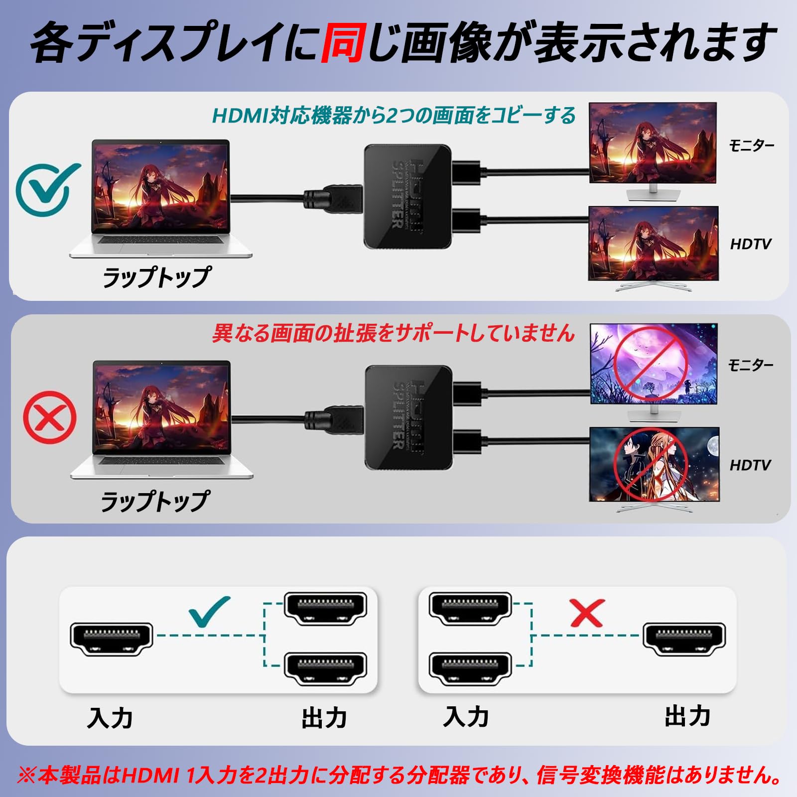 * 【 安心の1年保証】■ パッケージ内容:HDMIスプリッター本体 ×1、高速HDMIケーブル ×1、USB給電ケーブル ×1、取扱説明書(日本語) ×1■ 保証内容:1年間の保証が付いており、何かご不明な点があれば、サポートチームが迅速に対応いたします。